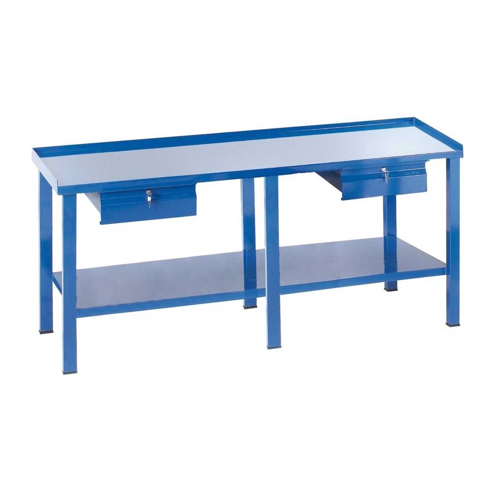 Banchi da lavoro dimensioni cm 200x70x88h, realizzati con robusta struttura in tubolare di acciaio, corredati da piano superiore in lamiera spessore 3 mm con bordo perimetrale di contenimento su tre lati (posteriore e laterali) alto 20 mm. Ripiano inferiore in lamiera monoblocco, gambe con piedini rivestiti. Negli allestimenti sono disponibili modelli a doppio cassetto, con cassetti laterali e armadietto, con doppia cassettiera o nella versione vuoto. Un cassetto è fornito di vaschetta scorrevole porta minuterie.