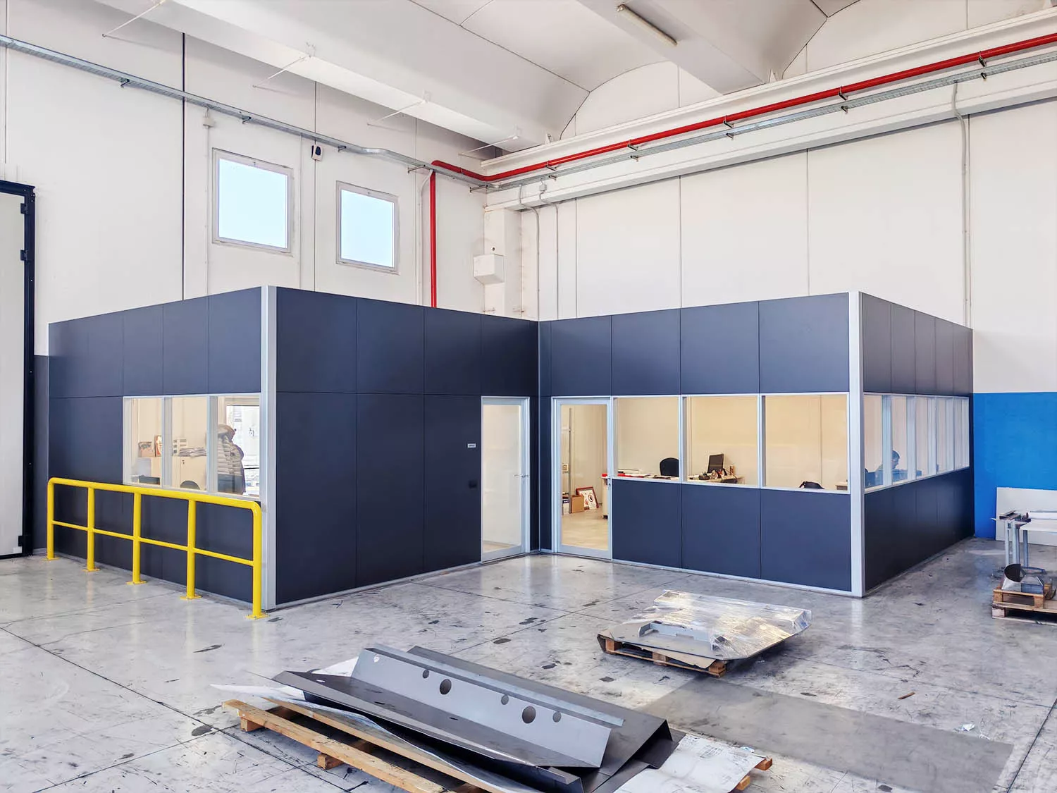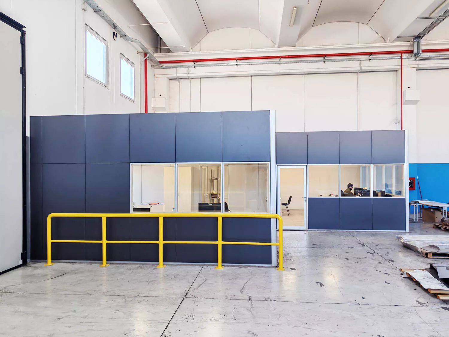 • SOLUZIONI VERSATILI E DI VELOCE ISTALLAZIONE: per ridurre i tempi di creazione del nuovo spazio si desiderava evitare il ricorso ad opere murarie che sempre implicano lungaggini burocratiche e lentezza di realizzazione, in quest’ottica si voleva inoltre sfruttare la piastrellatura preesistente in un angolo del capannone.