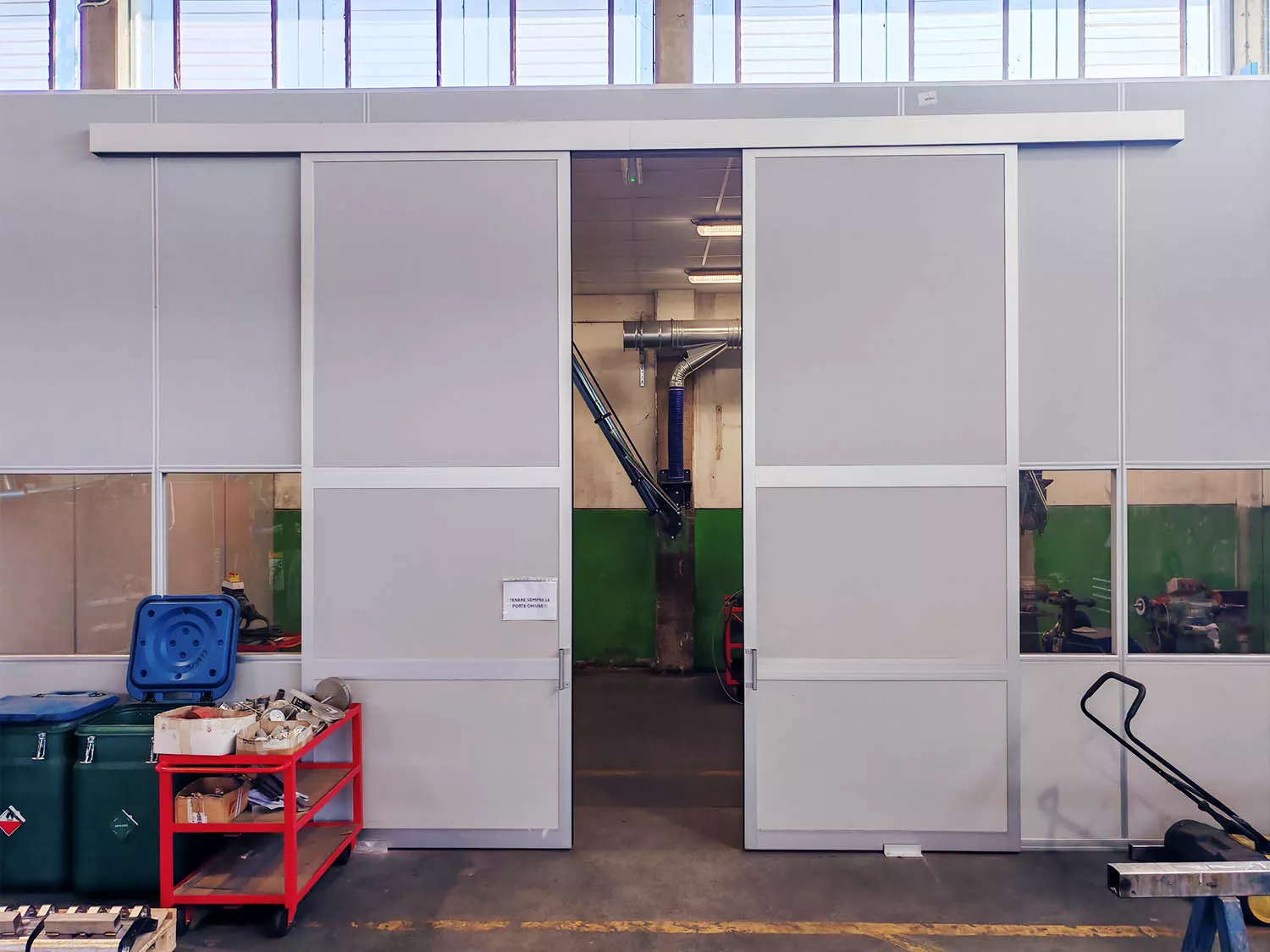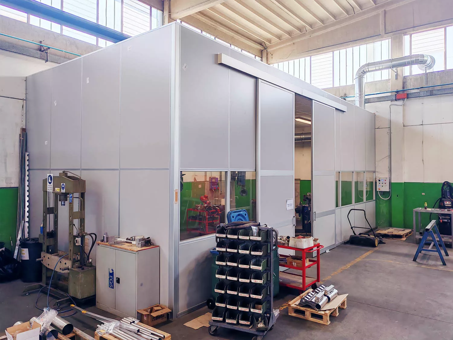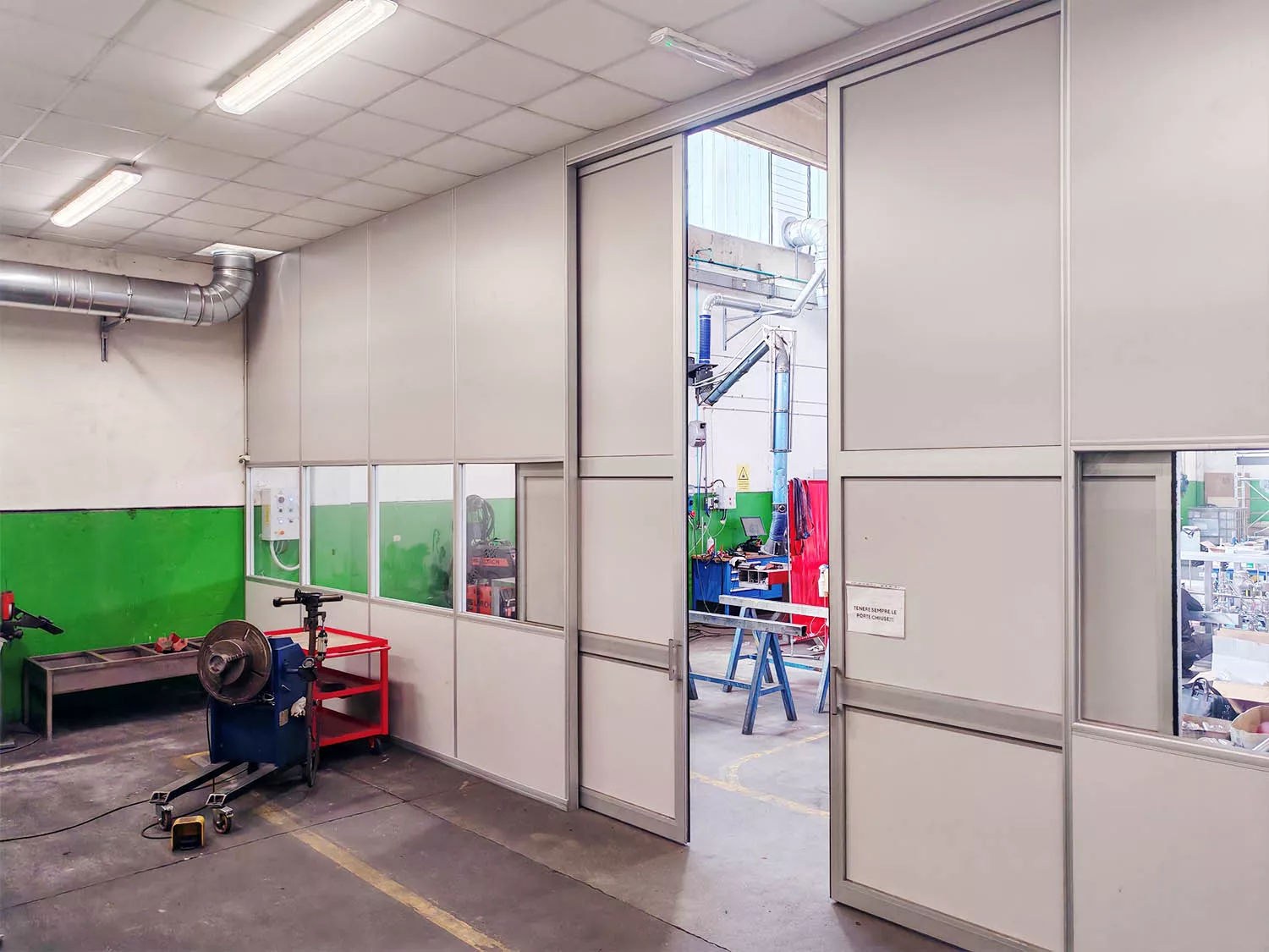 L’intervento ha permesso di creare un laboratorio chiuso, isolato acusticamente e privo di opere murarie, perfettamente integrato nell’officina esistente. La porta scorrevole extra-large garantisce accesso immediato ai macchinari di grandi dimensioni, mantenendo comfort operativo, pulizia e flessibilità d’uso.