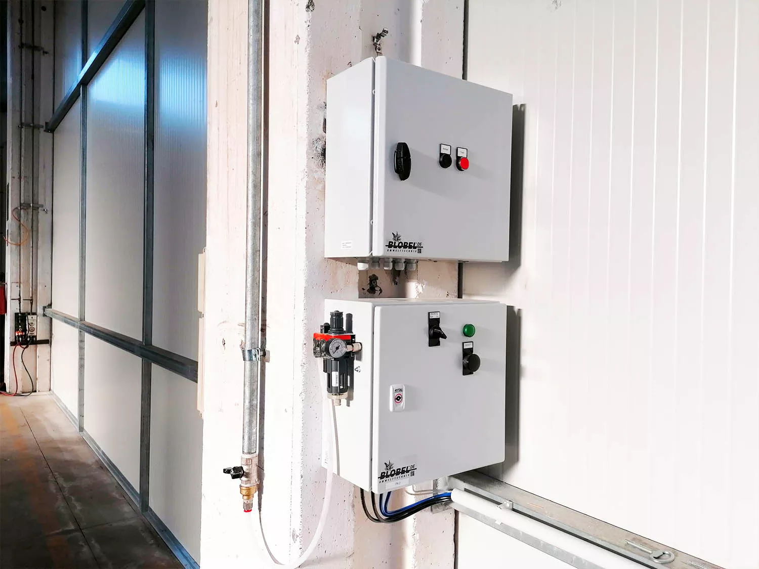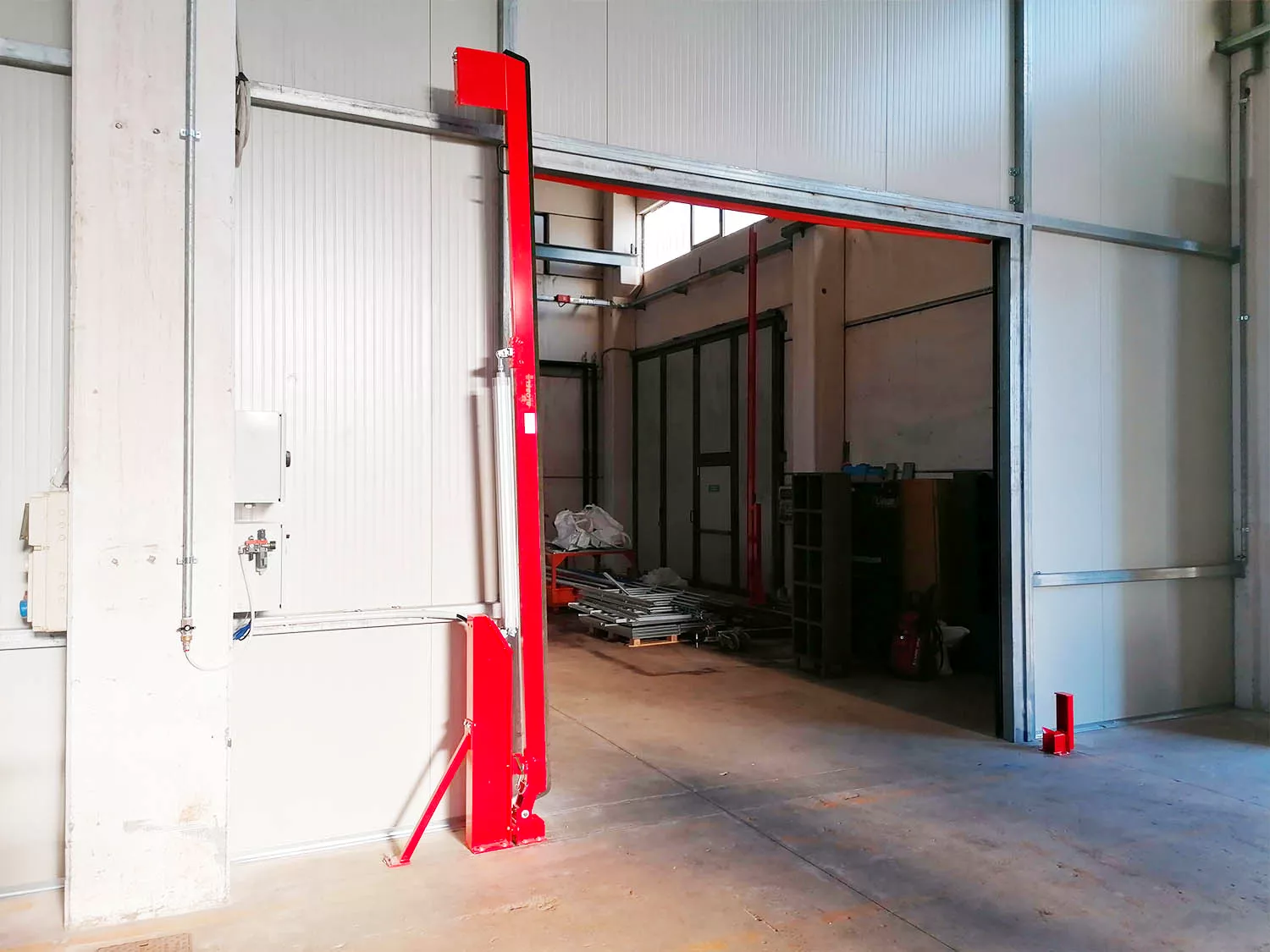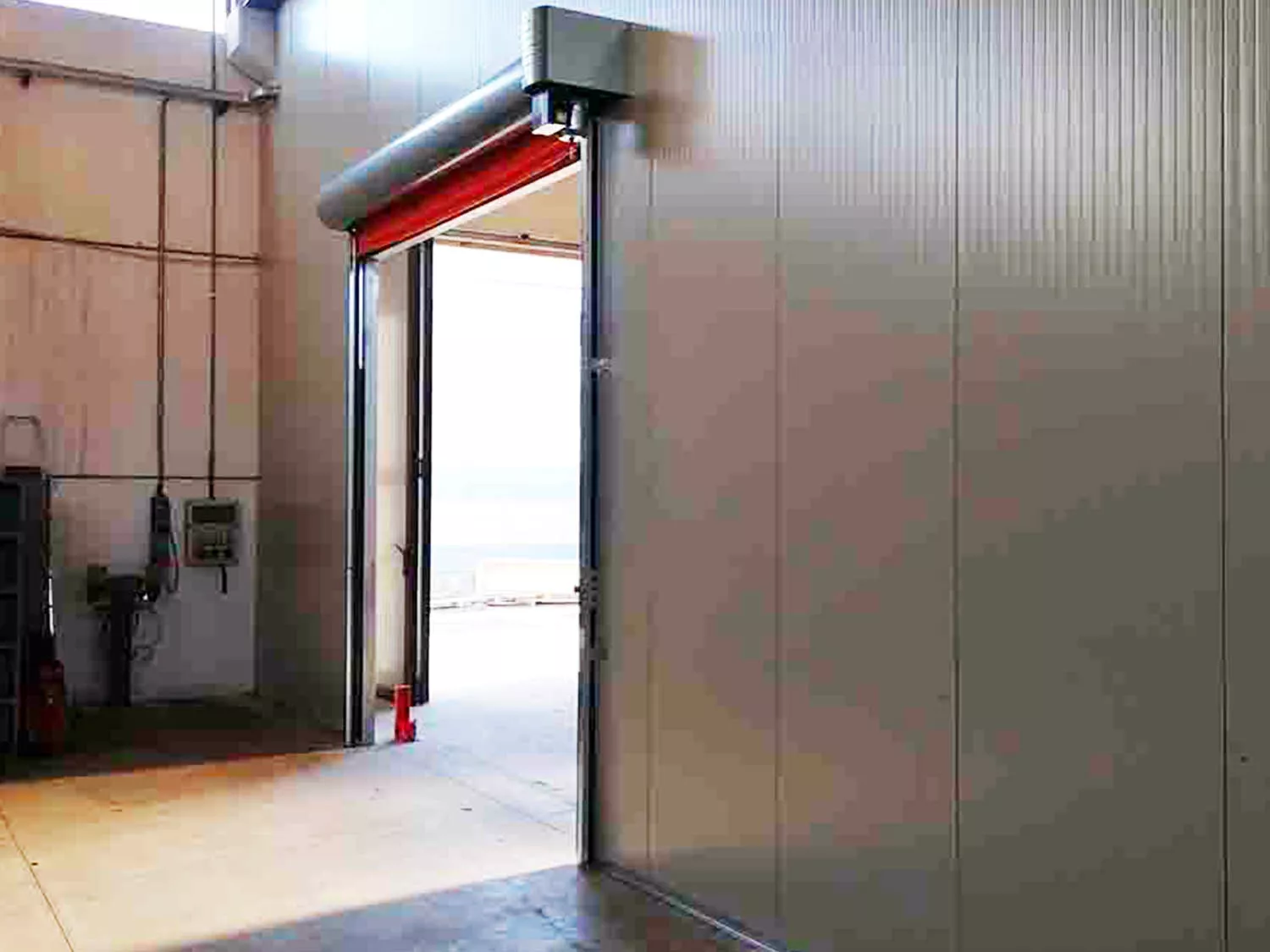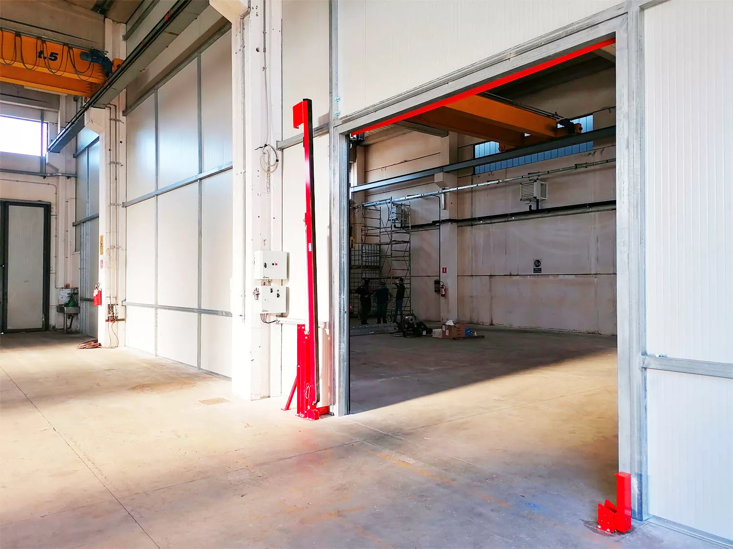 il lato sinistro della struttura, destinato a reparto produttivo, è stato isolato dal resto del capannone attraverso una parete creata con pannelli isolanti che evitano la dispersione dei fumi legati alle lavorazioni. Nella parete è stato previsto un varco per l’accesso alla zona di servizio centrale, in cui è stato istallato un portone ad avvolgimento rapido in pvc  da 3,50 x 3,50 m che permette al contempo isolamento e facilità di transito.
