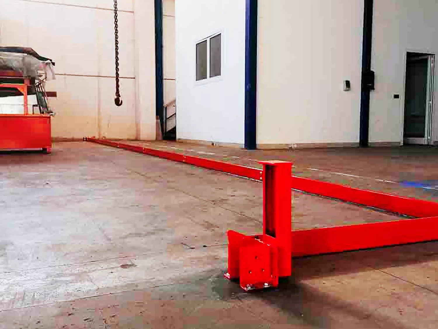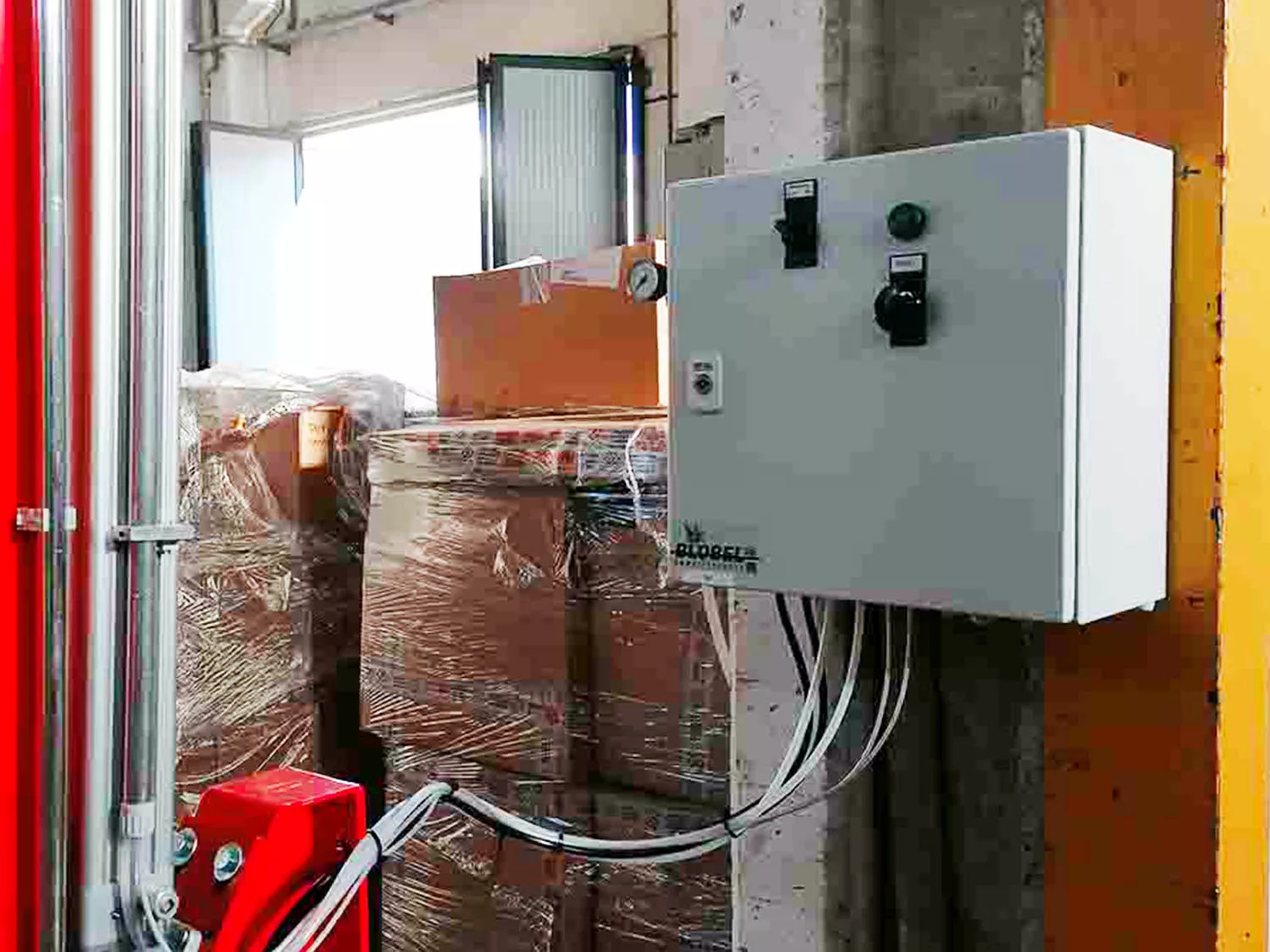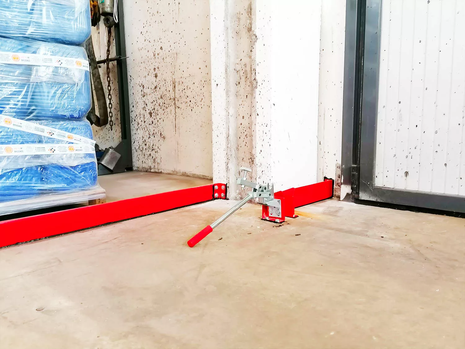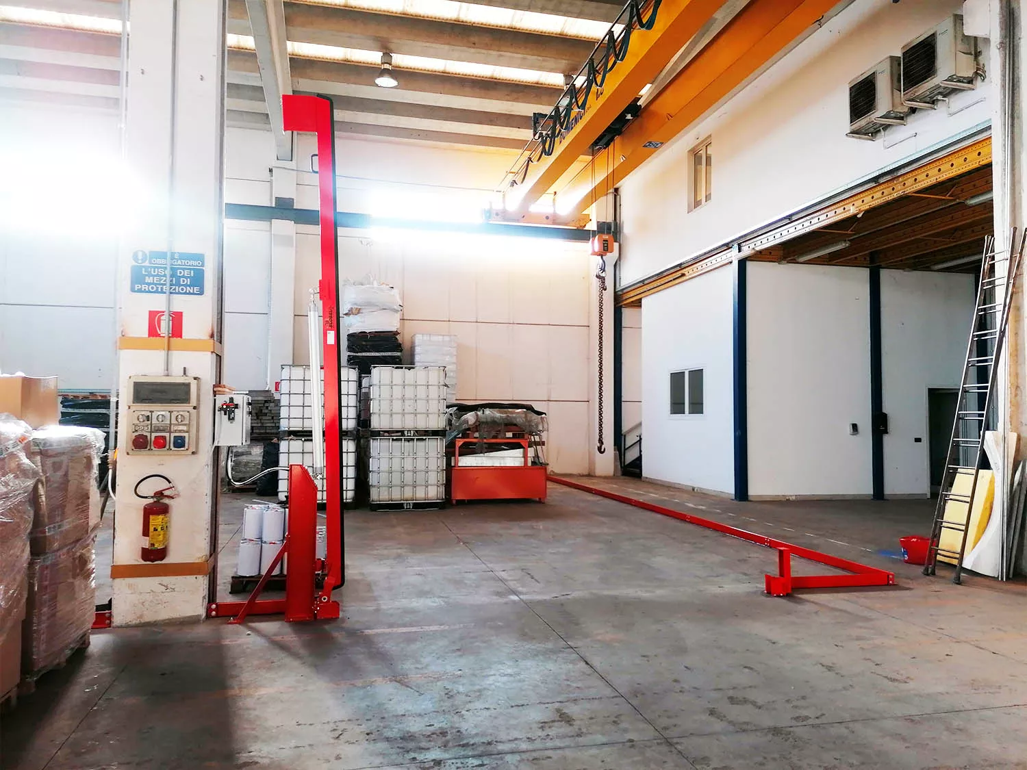a destra del capannone è stata ricavata la zona di stoccaggio, separata dall’area centrale di servizio grazie a dei profili di contenimento in lamiera, alti 10 cm, interrotti da un varco di passaggio di 3,50 m. In corrispondenza di tale varco e del portone rapido della zona produzione sono state istallate due barriere di contenimento incernierate  su un lato, costituite da una sbarra in alluminio sollevabile e girevole dell’altezza di 10 cm. Due centraline di comando posizionate nella zona di servizio permettono l’attivazione automatica delle barriere in caso di necessità.
