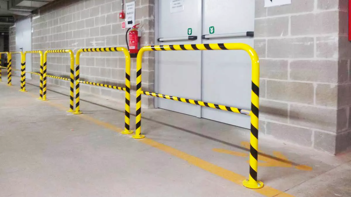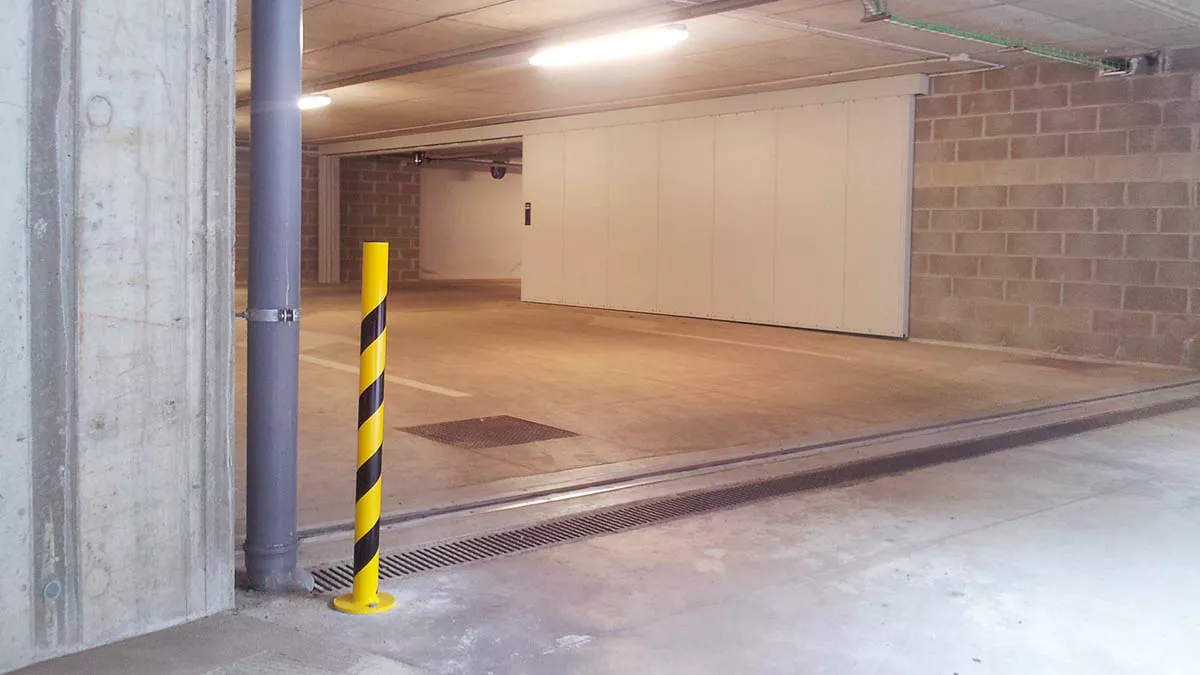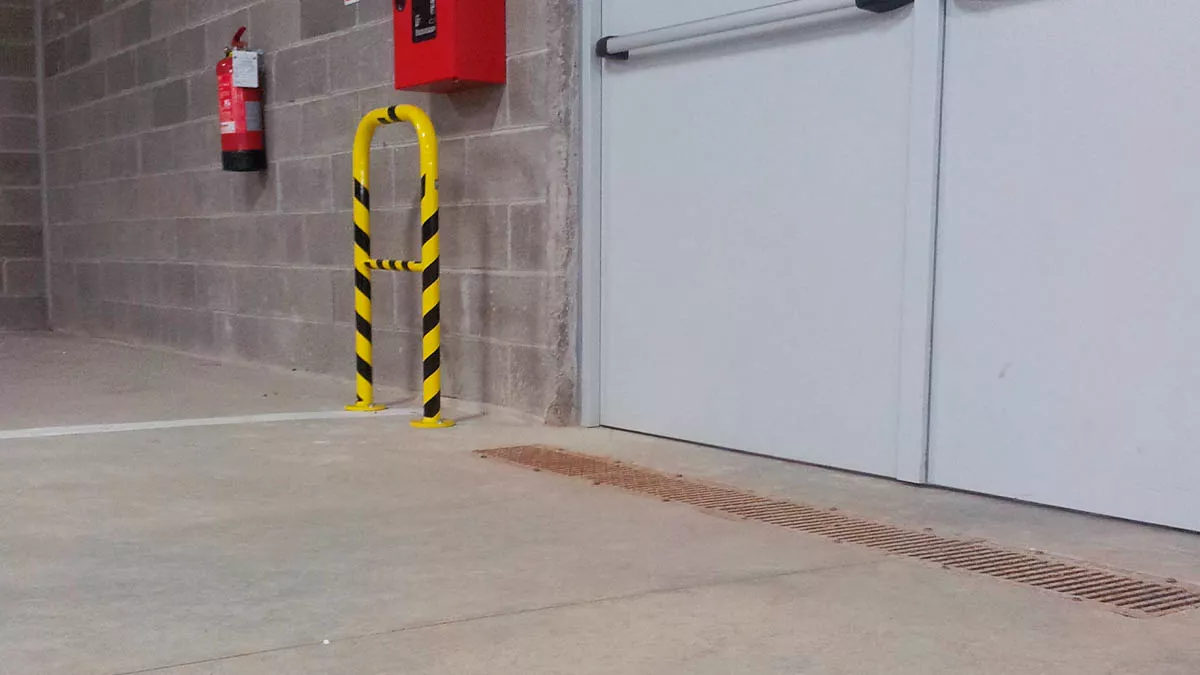 per preservare l’impiantistica antincendio in modo che non ne venga compromessa l’efficienza abbiamo installato dei piantoni in acciaio di forma tubolare in corrispondenza delle porte taglia fuoco. Sotto alle cassette porta manichetta sono stati fissati dei divisori lineari da 50 cm con traverso, che impediscono alle auto di colpire la cassetta, ma non ne limitano l’accessibilità in caso di emergenza.
