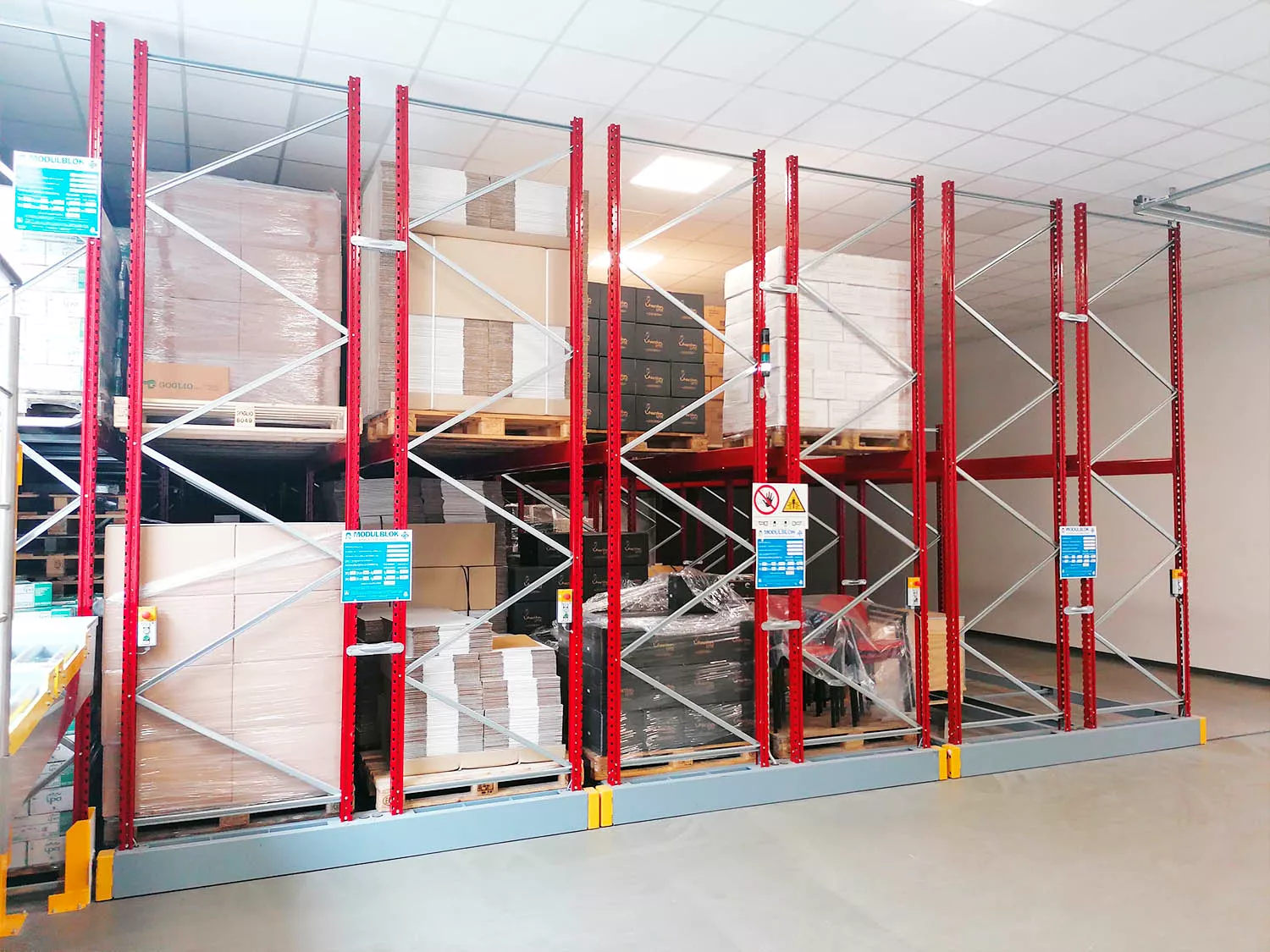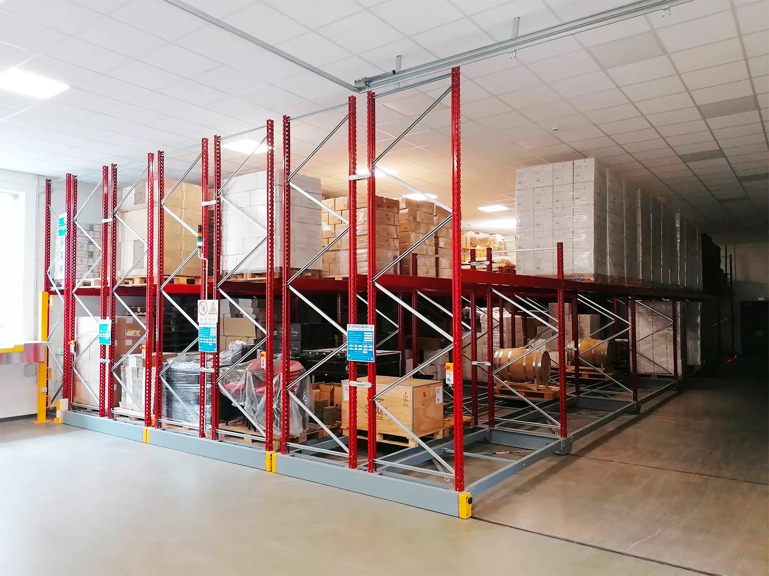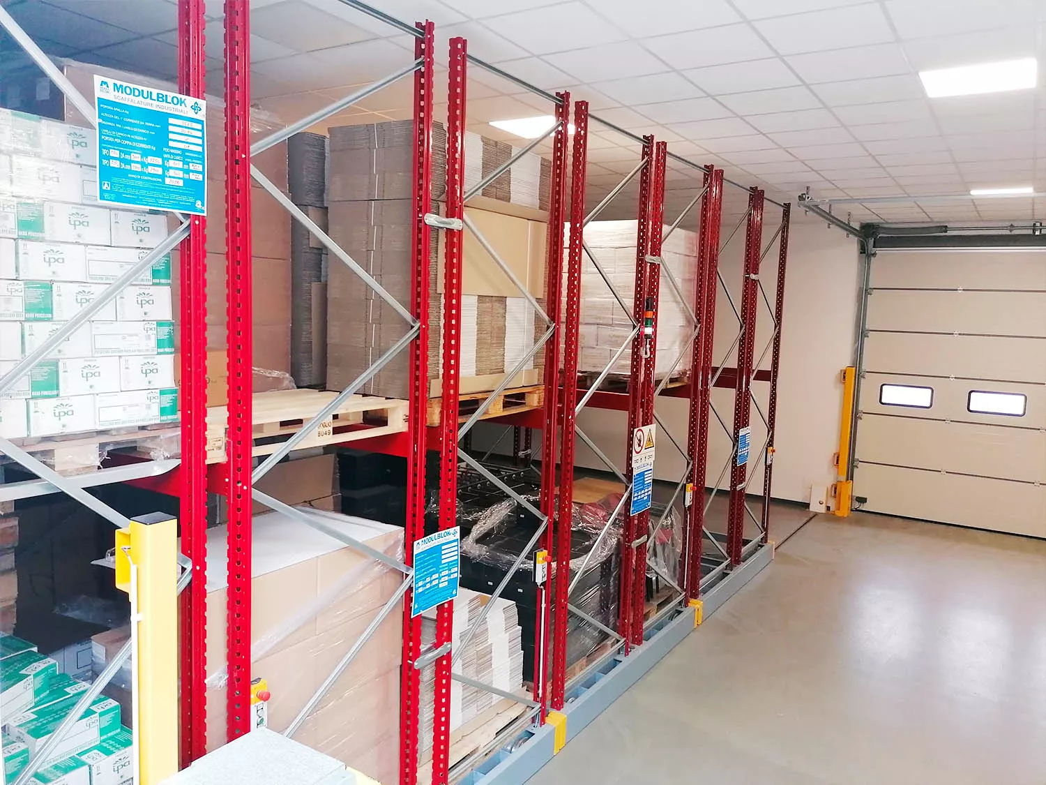 Installazione di un magazzino compattabile con scaffalatura per pallet.