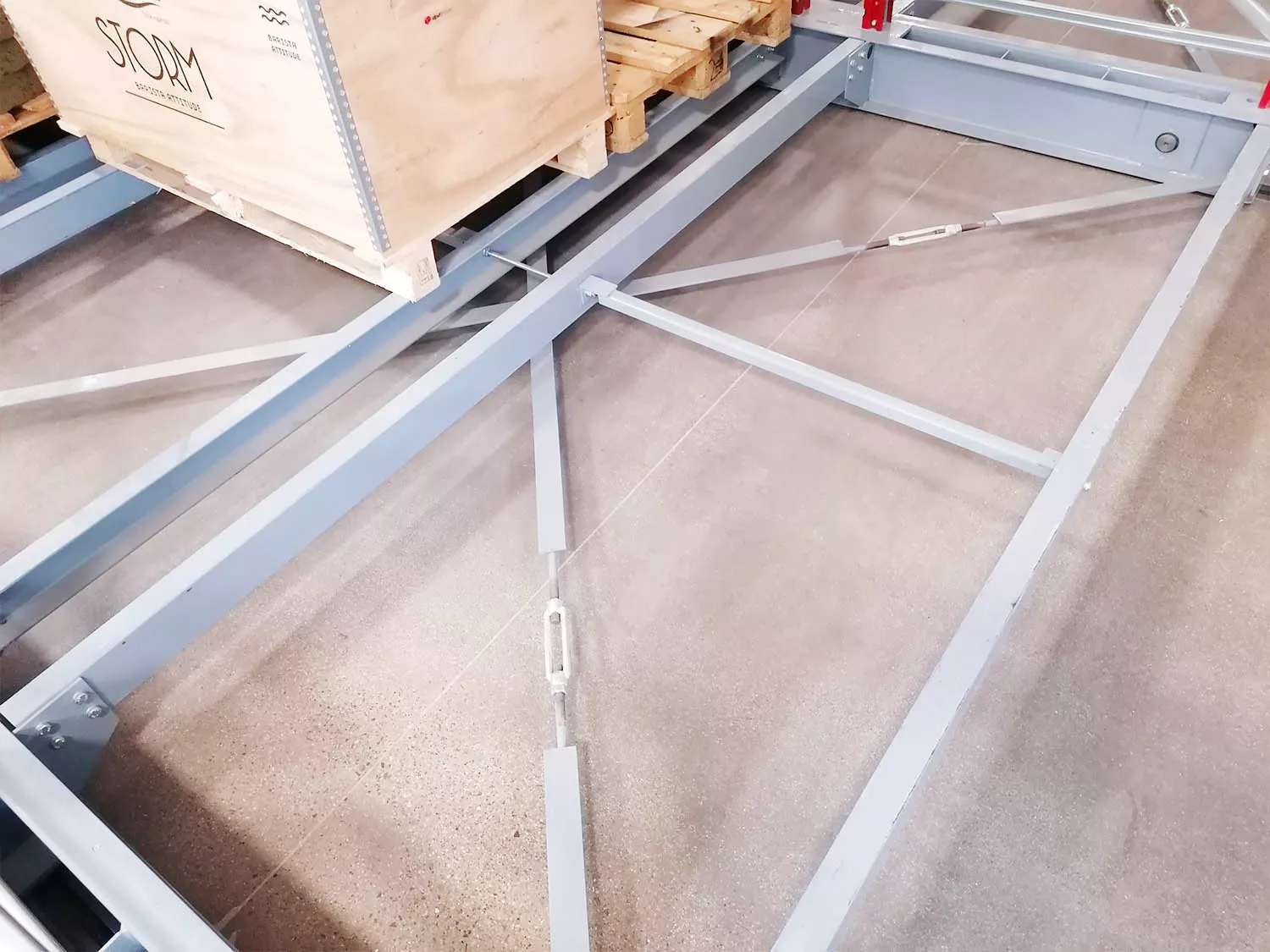 al livello del pavimento sono state posizionate 6 file di binari da 10 m cad. per una portata di 6 tonnellate ciascuna. Sui binari sono state istallate basi mobili scorrevoli che possono sopportare ognuna 1,6 tonnellate.