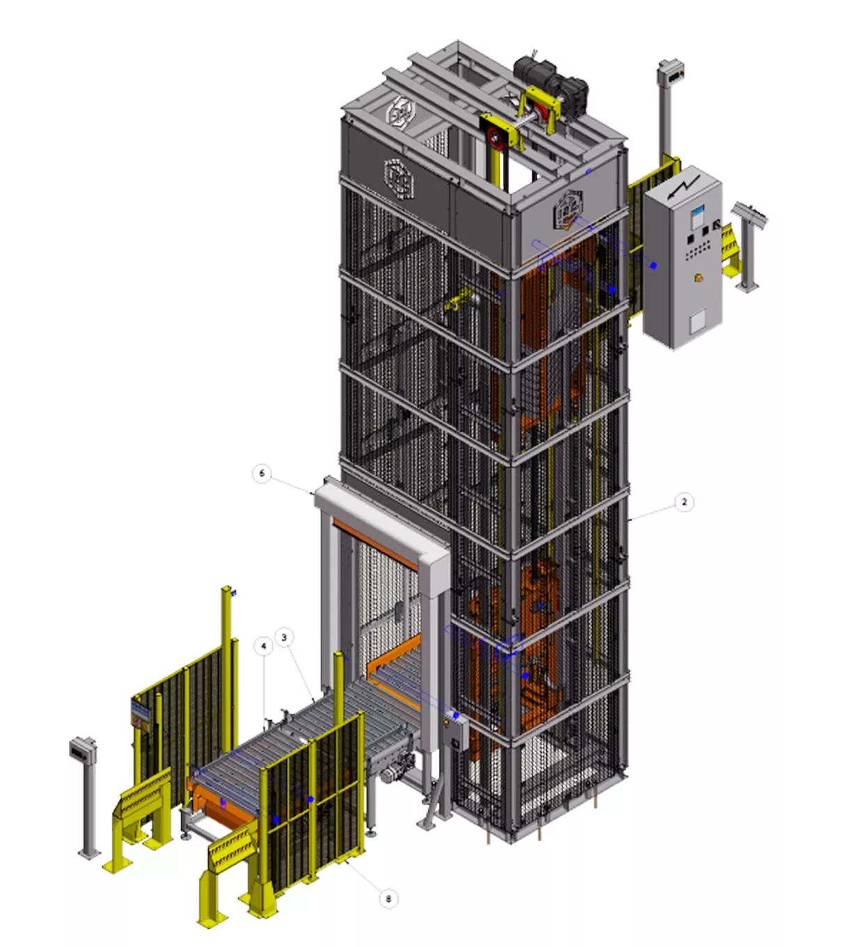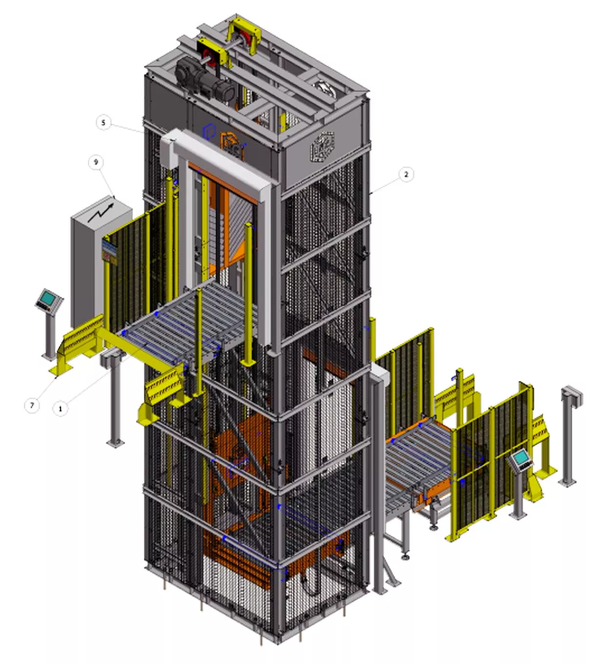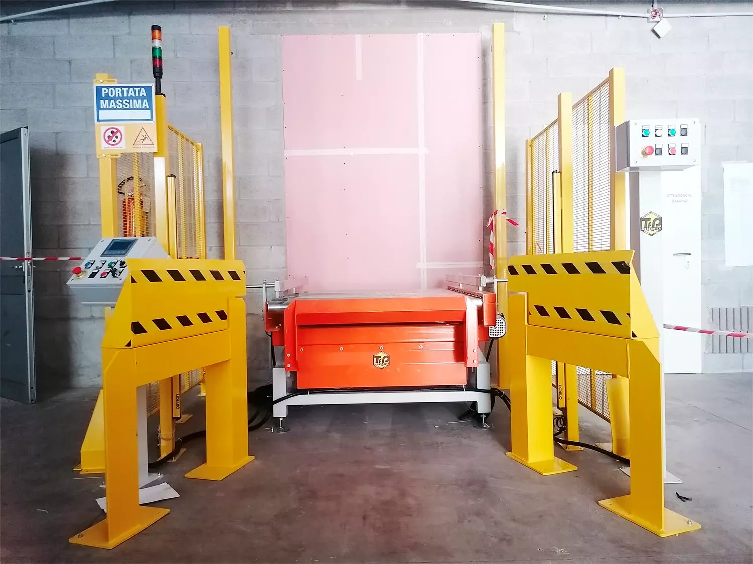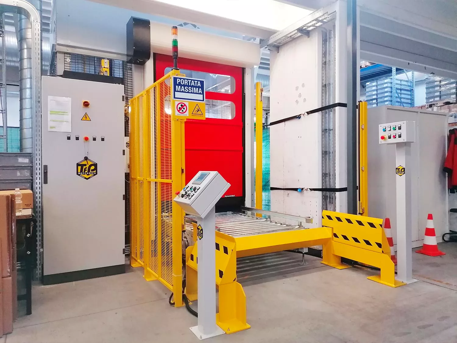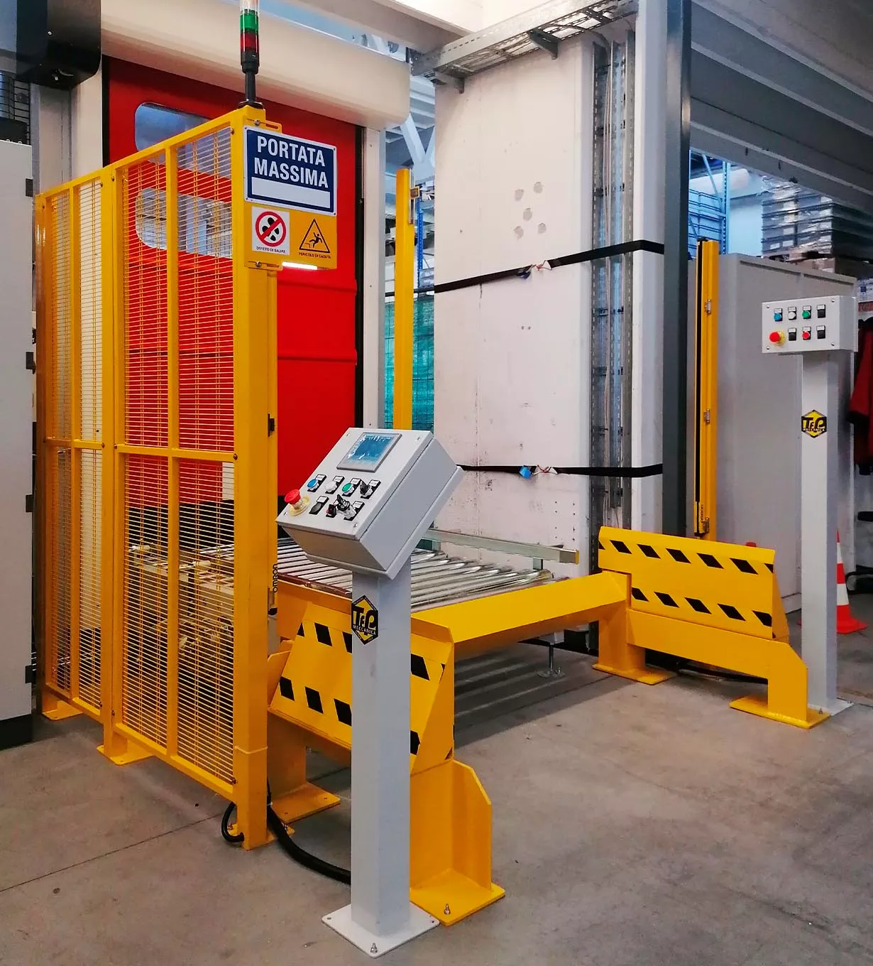 per permettere lo spostamento dei pallet da un piano all’altro abbiamo installato un elevatore automatico, in cui il carico e lo scarico avviene grazie ad un sistema di traslazione a rulli motorizzati. In questo modo il pallet viene posizionato dall’operatore direttamente sulla rulliera e trasportato al piano desiderato dove può essere prelevato dal secondo operatore. Grazie al vano di corsa autoportante non sono state necessarie costose opere murarie, i due accessi contrapposti rispondono alla diversa configurazione dei due livelli di carico e sono stati dotati di porte ad avvolgimento e barre anticaduta.