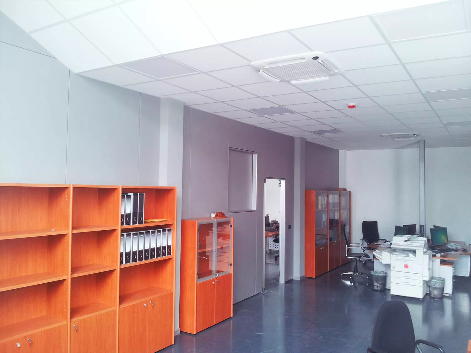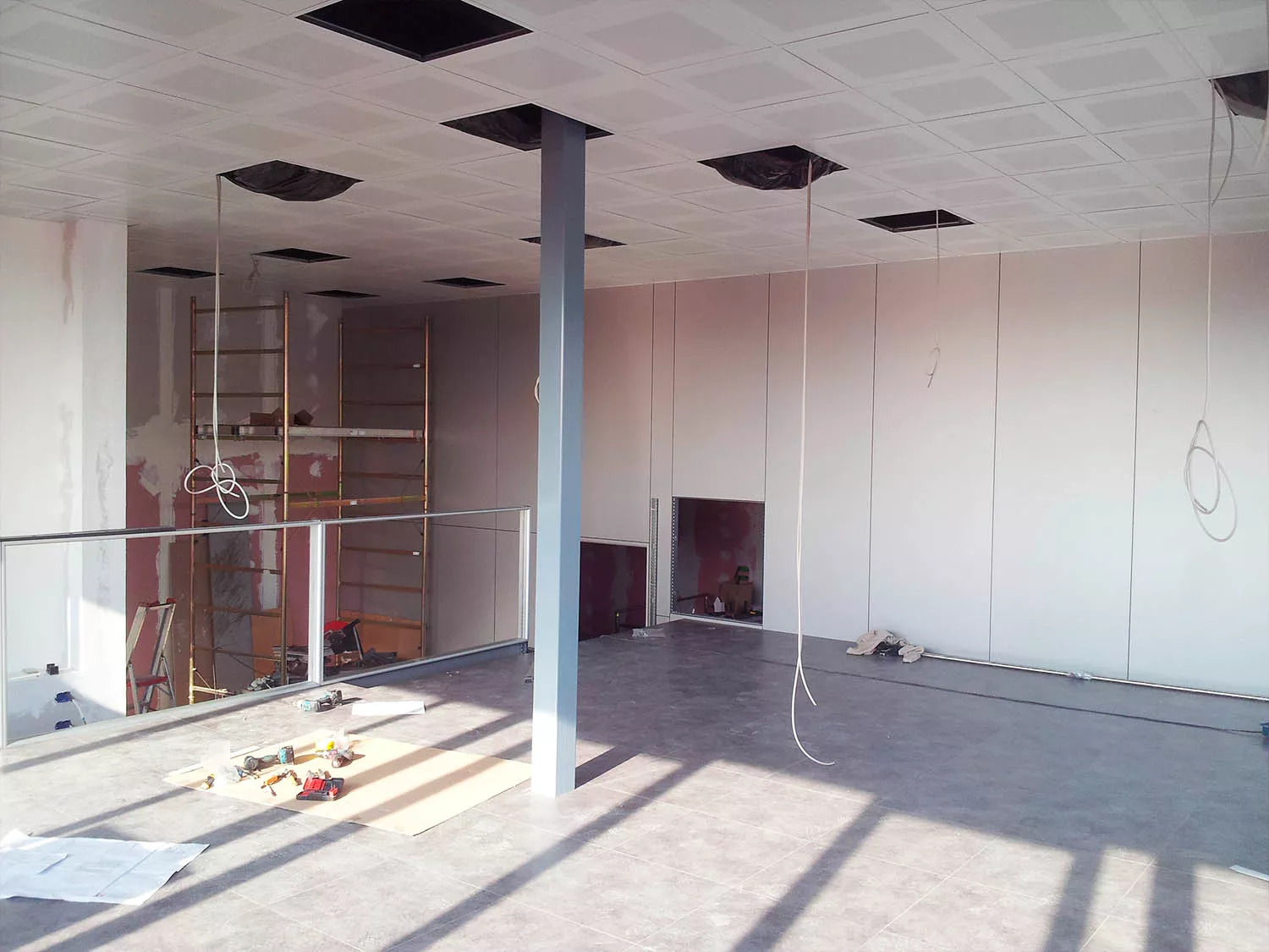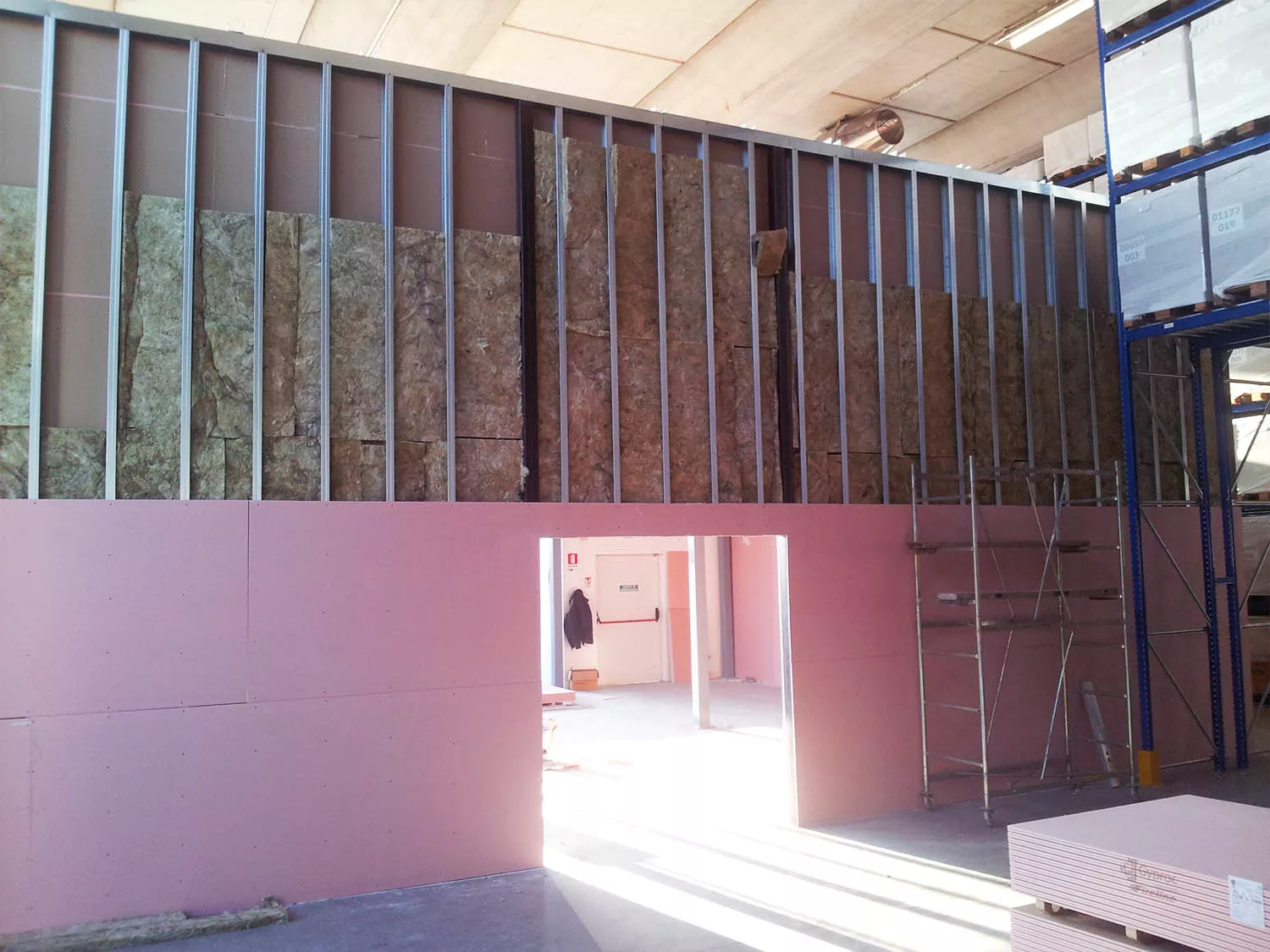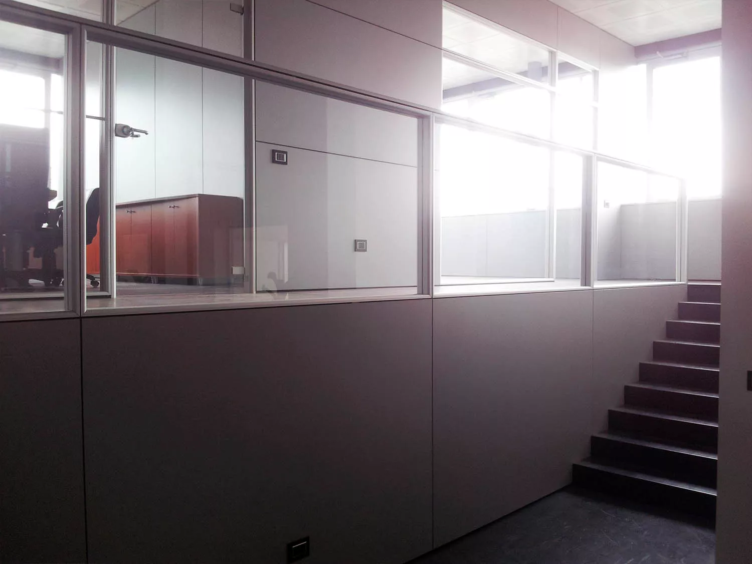per la realizzazione della zona uffici, nella parte inferiore del soppalco è stata sfruttata la presenza di pareti perimetrali, mentre i due lati aperti sono stati chiusi mediante una parete in cartongesso rivestita con pannelli ciechi.