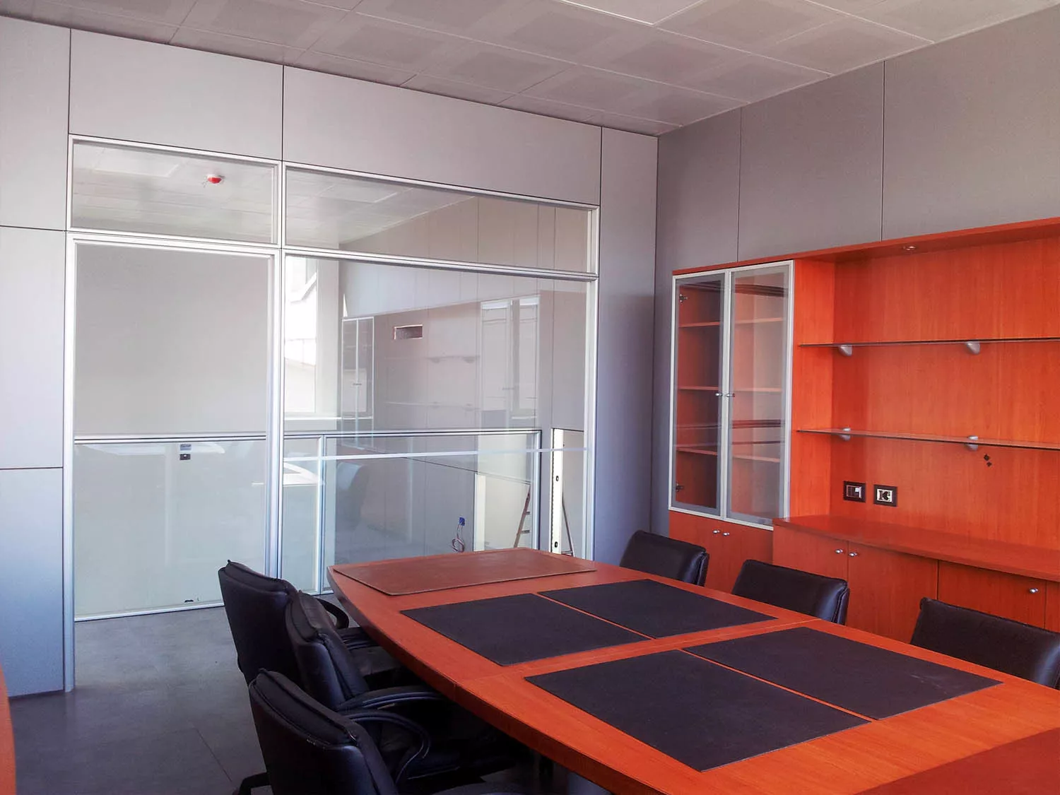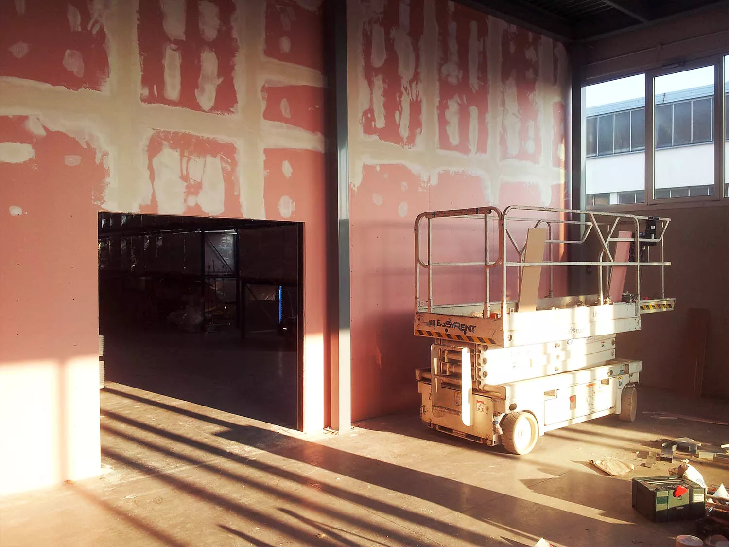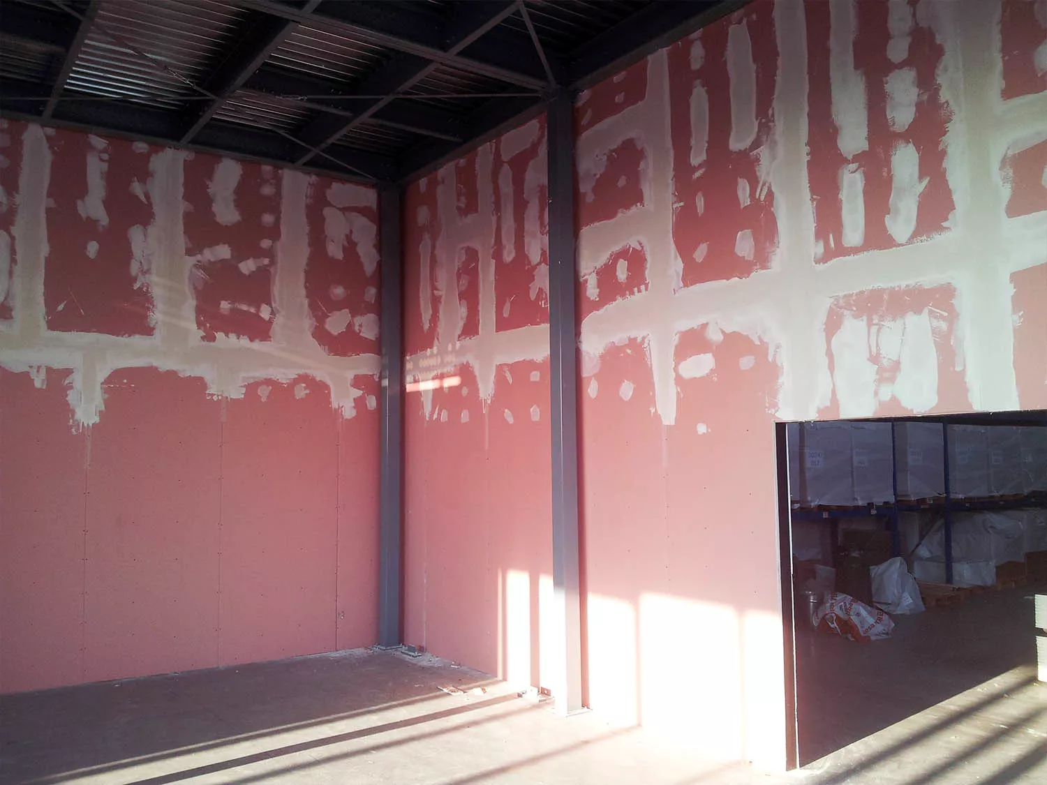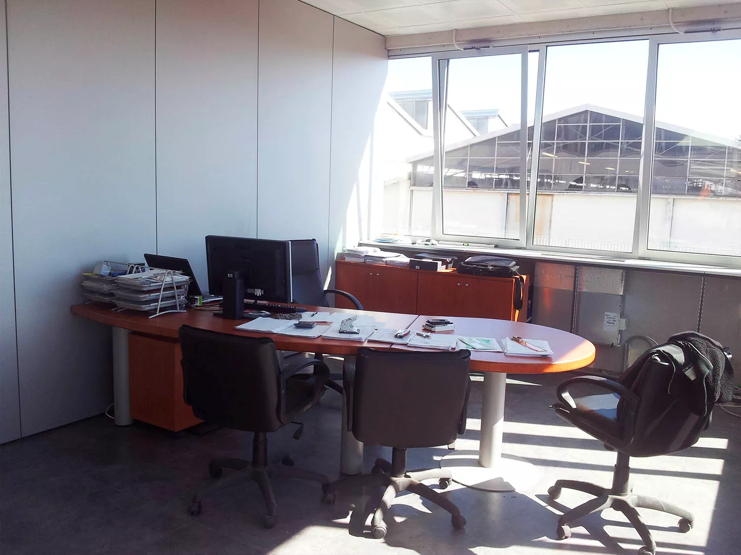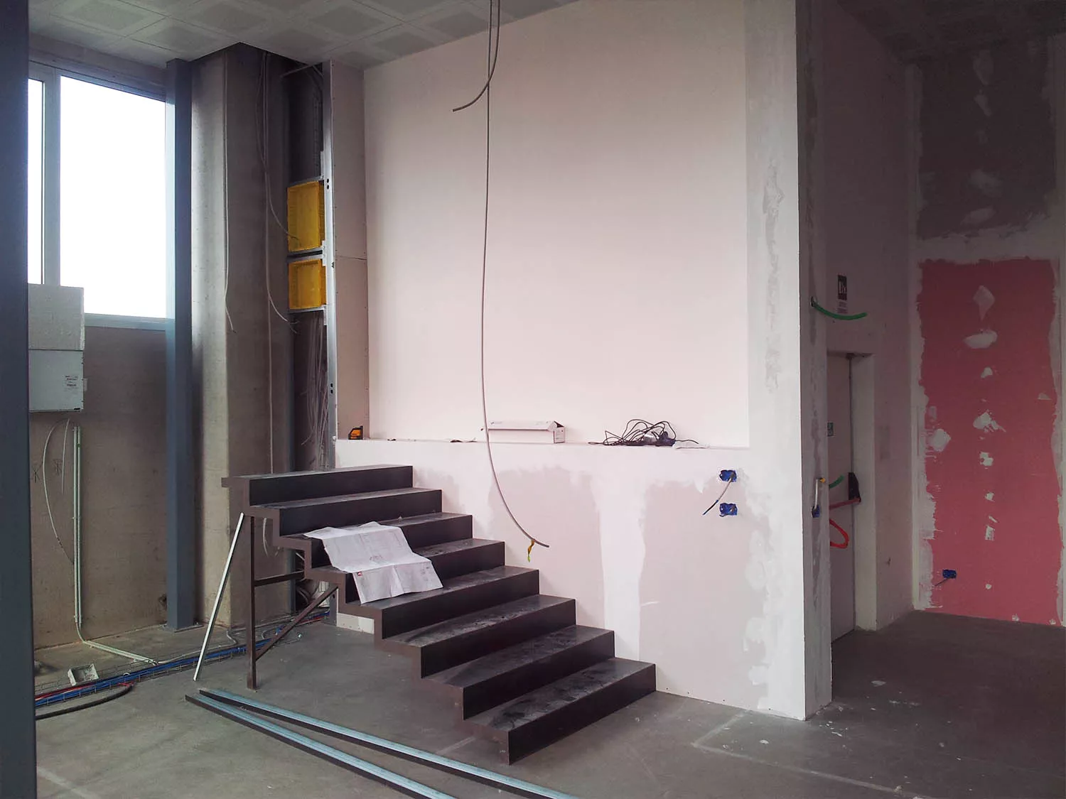 per la realizzazione della zona uffici, nella parte inferiore del soppalco è stata sfruttata la presenza di pareti perimetrali, mentre i due lati aperti sono stati chiusi mediante una parete in cartongesso rivestita con pannelli ciechi.