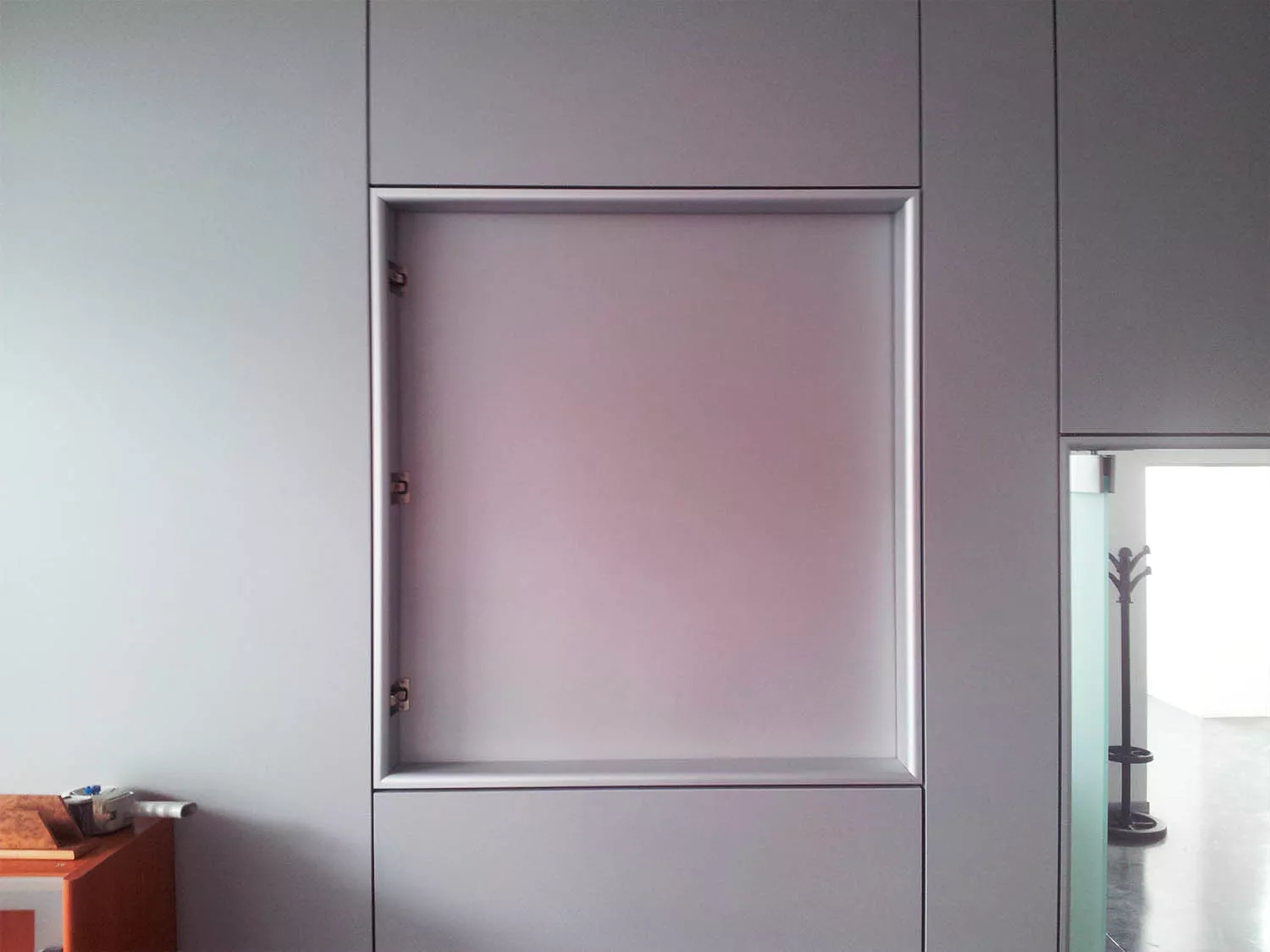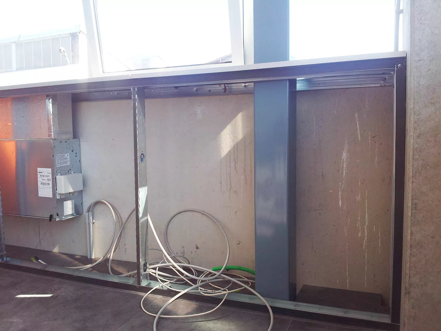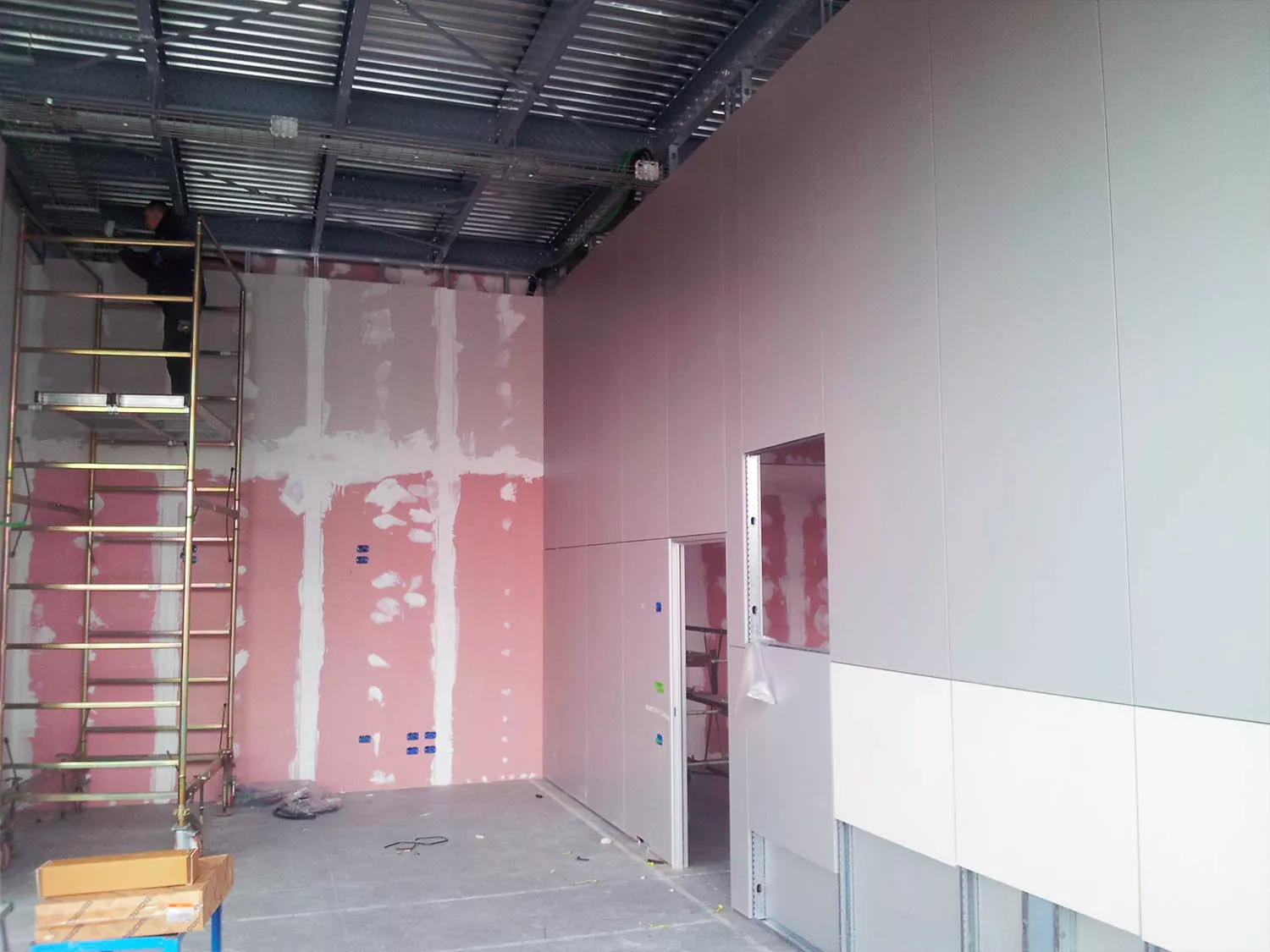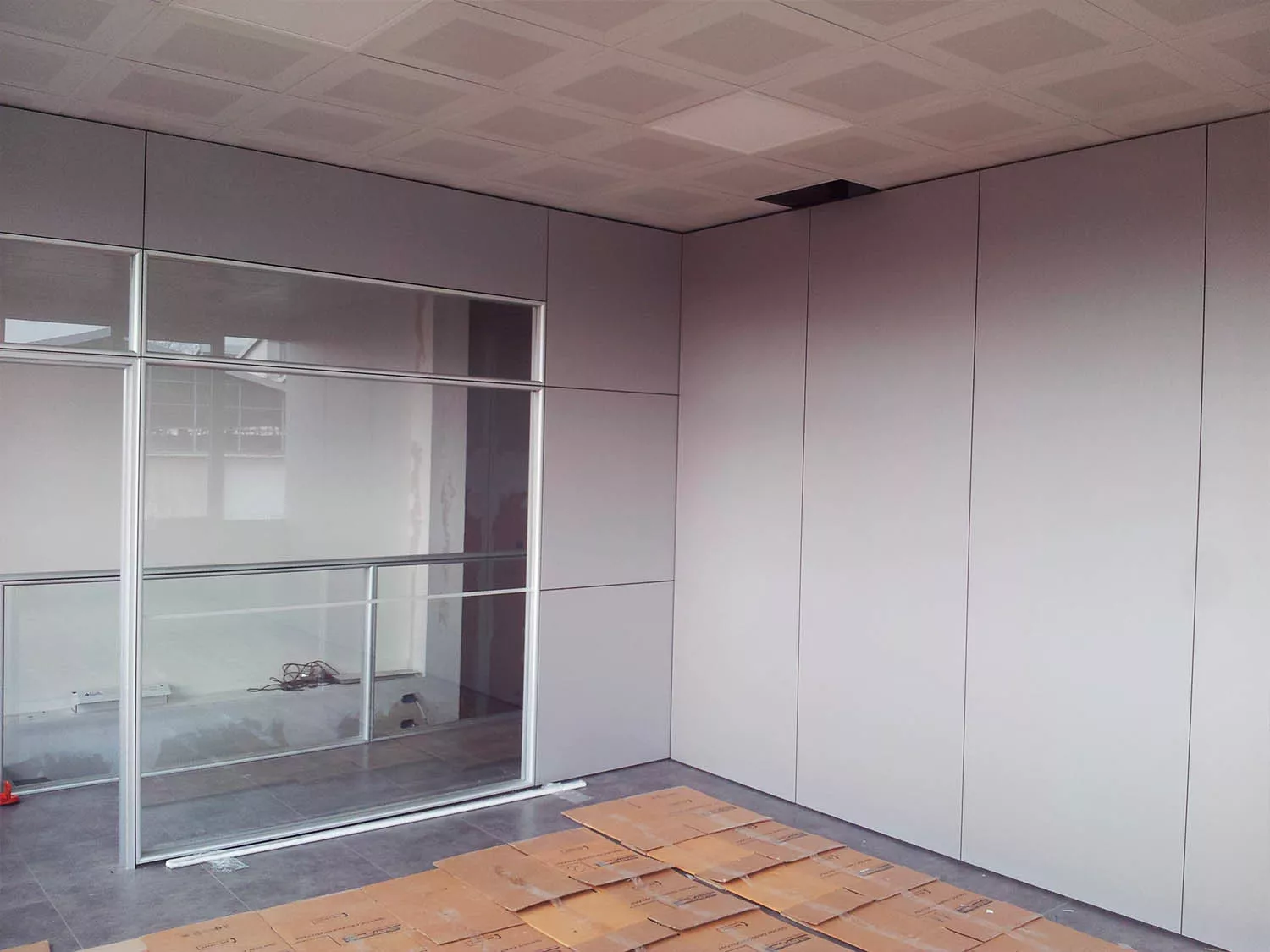 per la realizzazione della zona uffici, nella parte inferiore del soppalco è stata sfruttata la presenza di pareti perimetrali, mentre i due lati aperti sono stati chiusi mediante una parete in cartongesso rivestita con pannelli ciechi.