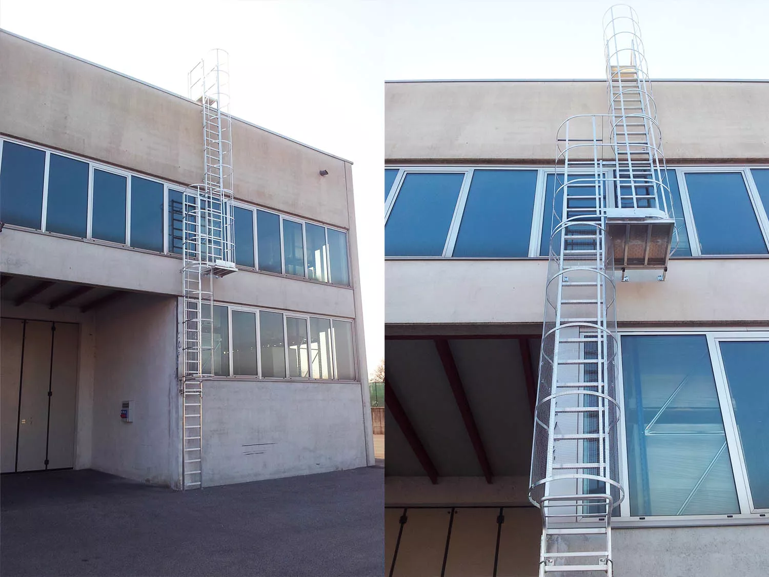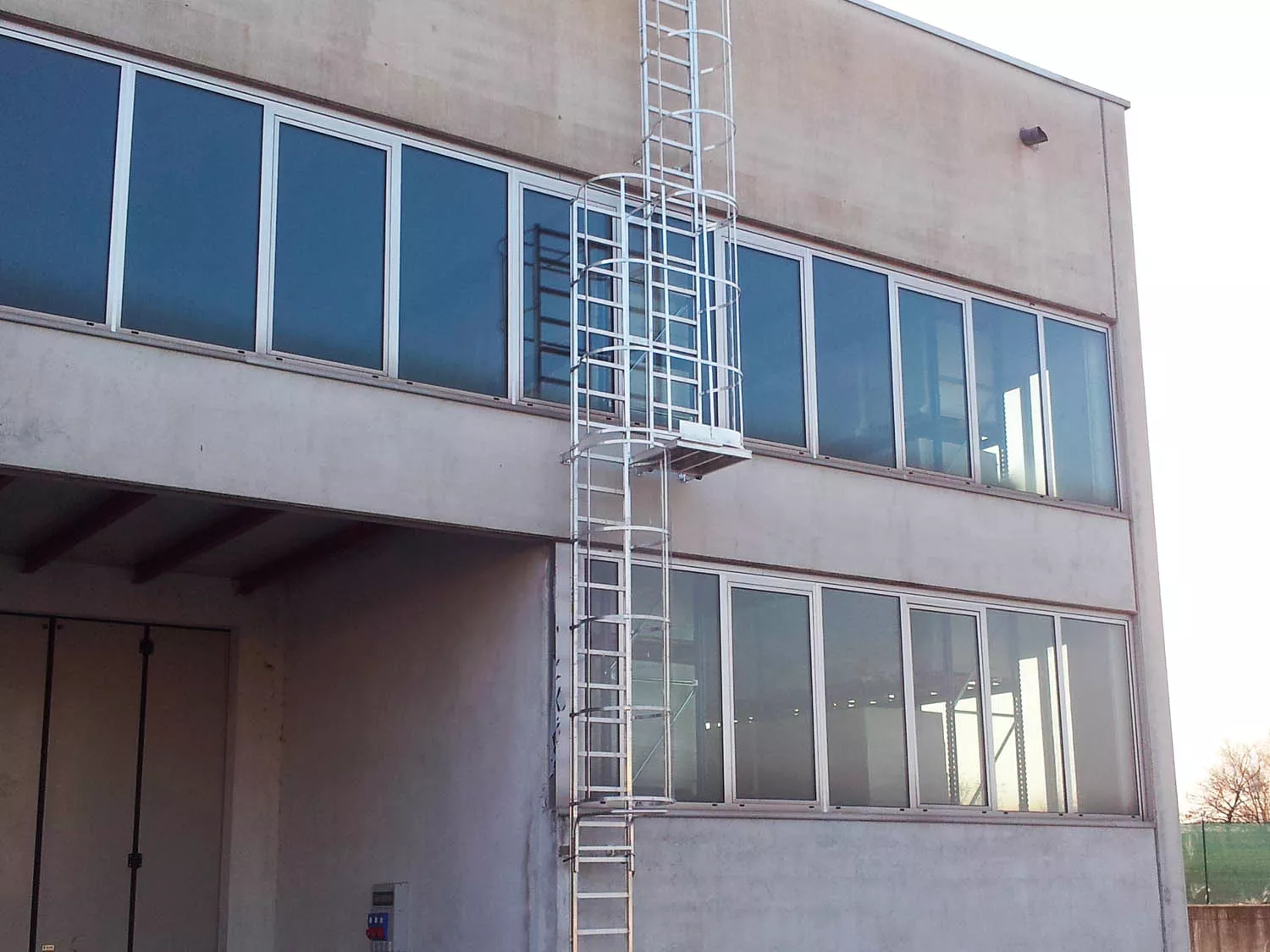 all’esterno dell’edificio è stata istallata una scala con gabbia in alluminio con piano intermedio e piano di sbarco e discesa per permettere l’accesso in sicurezza al tetto del capannone, secondo quanto previsto dalle normative di sicurezza.