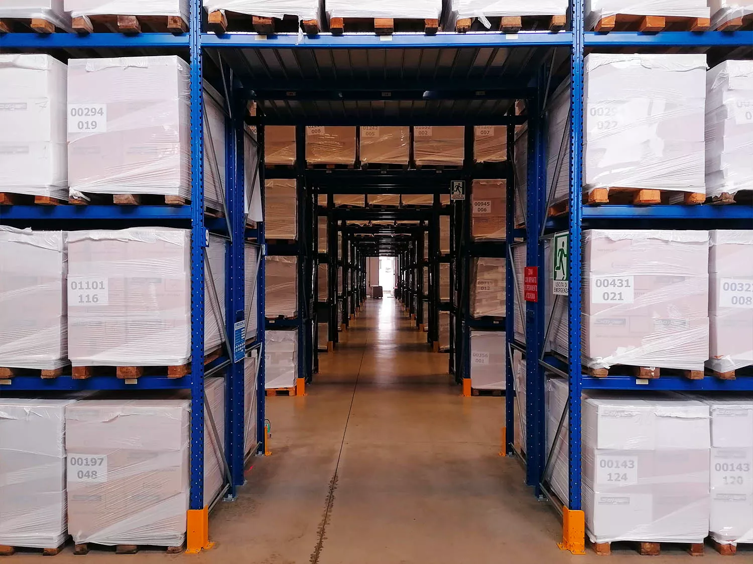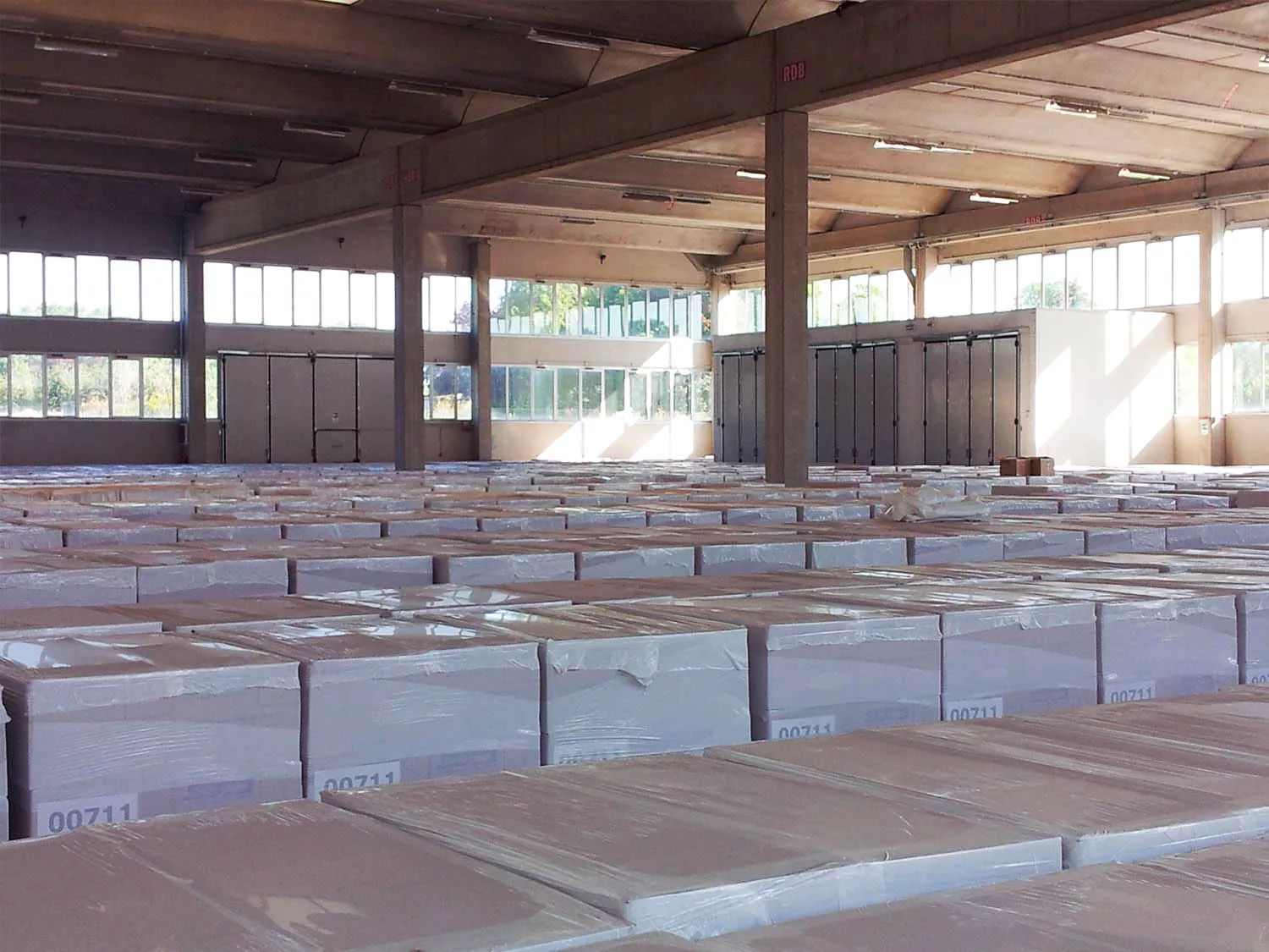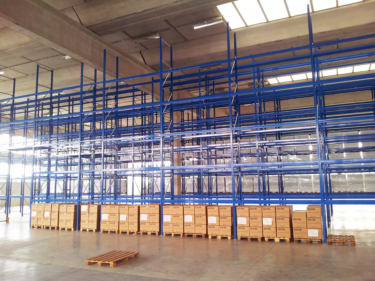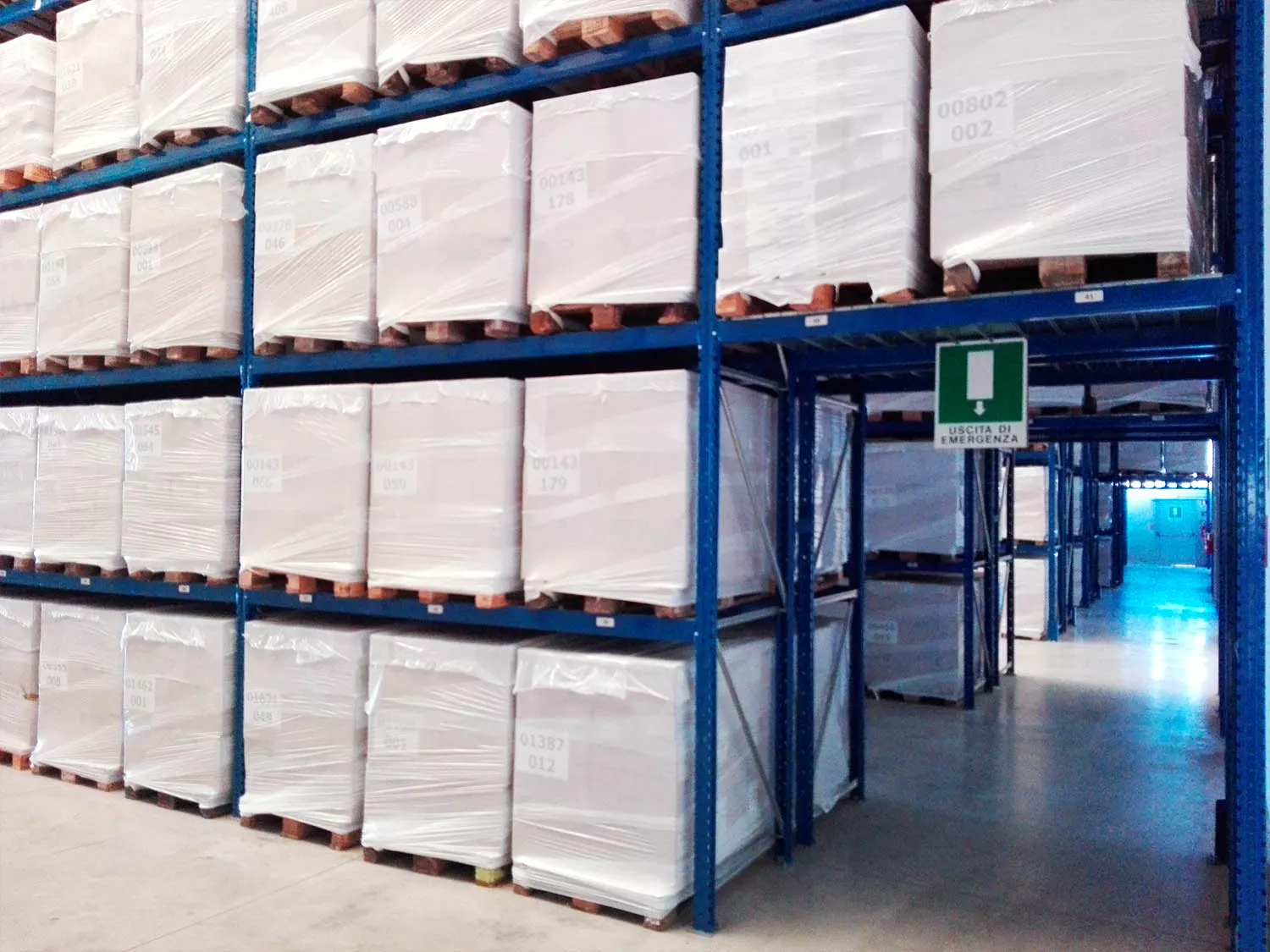 per stoccare gli scatoloni contenenti i faldoni d’archivio abbiamo optato per una scaffalatura porta pallet che permettesse un facile accesso e prelievo della documentazione cartacea. Le spalle alte 8 m sfruttano tutta l’altezza disponibile, mentre la superficie è quasi completamente occupata dalle undici file lunghe dai 60 agli 80 m, per un totale di 20.800 posti pallet. Alcuni tunnel di passaggio spezzano le file per permettere un accesso più agile ai i vari corridoi e per garantire vie di fuga in caso di necessità. La struttura è stata realizzata con materiali certificati all’origine secondo norma UNI EN 10204.