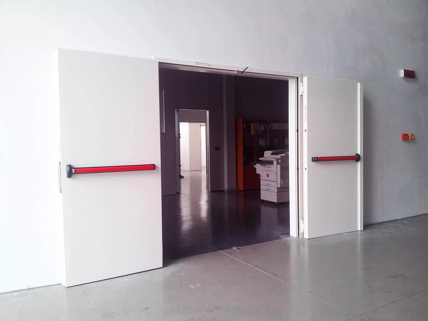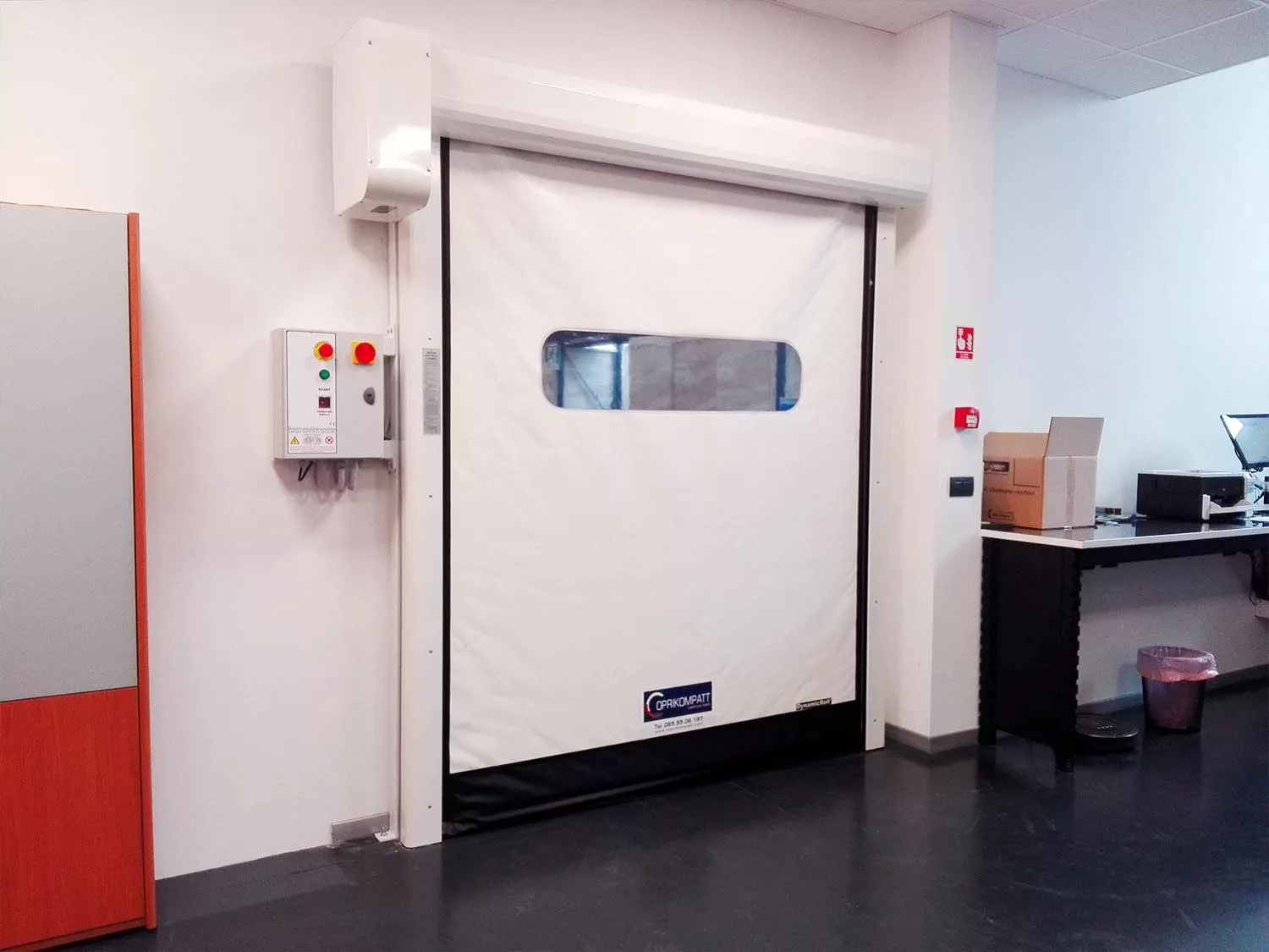 tra il magazzino e i nuovi uffici è stato mantenuto un varco d’accesso corredato da portone tagliafuoco che può essere chiuso in caso di incendio. Per garantire il transito tra i due ambienti e, al contempo, l’isolamento termico e acustico è stato installato in corrispondenza del varco anche un portone ad avvolgimento rapido in PVC con fotocellula.