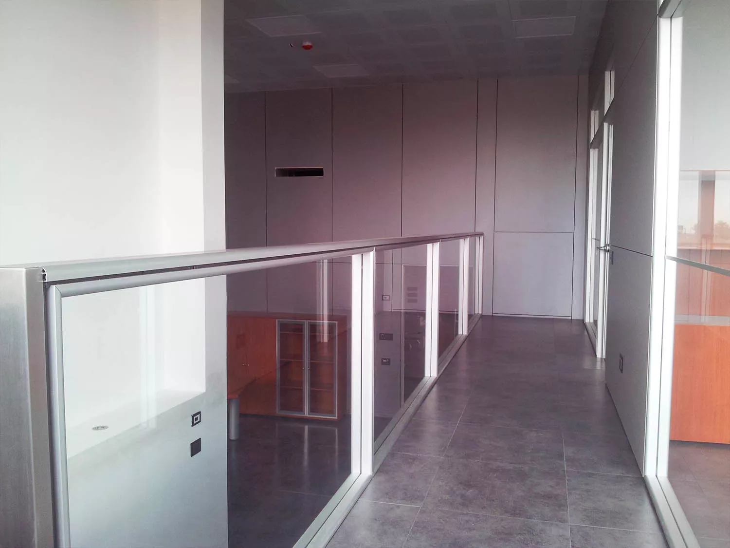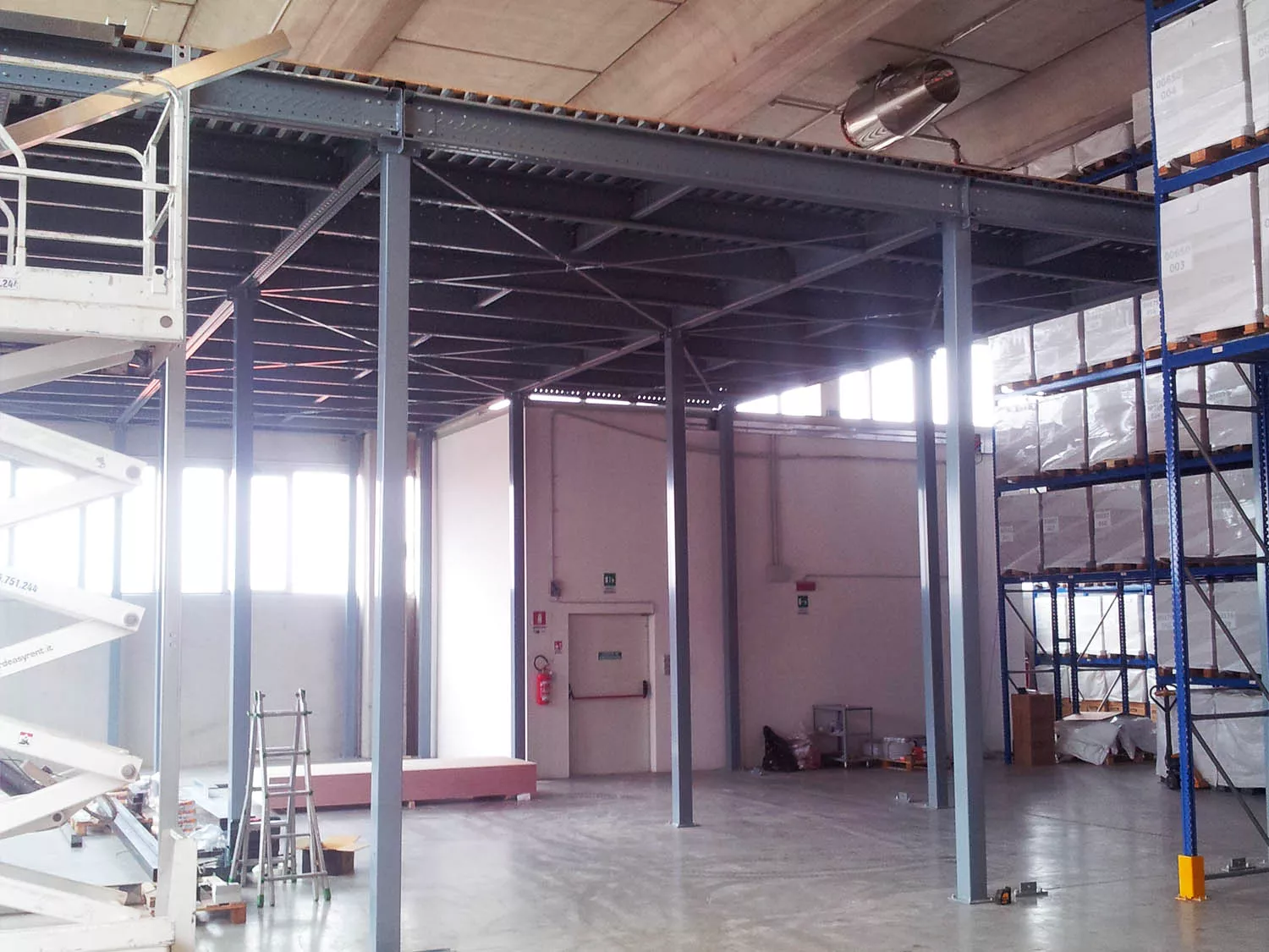 in un angolo del capannone di ca. 200 mq abbiamo realizzato una struttura soppalcata con altezza 5 m che potesse ospitare nella parte bassa un’area ad uso ufficio, ma che fosse già predisposta per un ampliamento futuro di questa zona fino a sfruttare tutti i 10 mt di altezza dell’edificio. Il soppalco è sostenuto da 19 colonne portanti e 61 travi tra principali e secondarie, il piano di calpestio è in lamiera grecata più truciolare grezzo. La portanza è di 350 kg/mq per carico accidentale uniformemente distribuito.