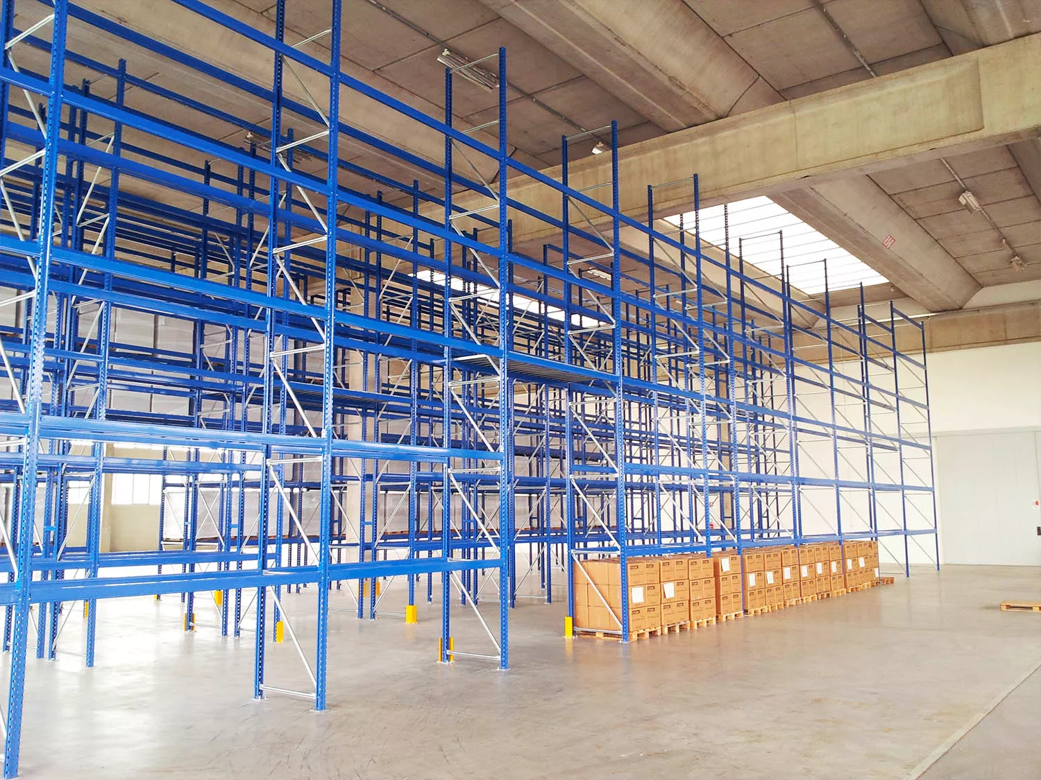 installazione di una scaffalatura porta pallet per lo stoccaggio intensivo dei documenti, montaggio di un soppalco a travi profilate per la creazione di zone ufficio allestite con pareti divisorie e complete di tutto.