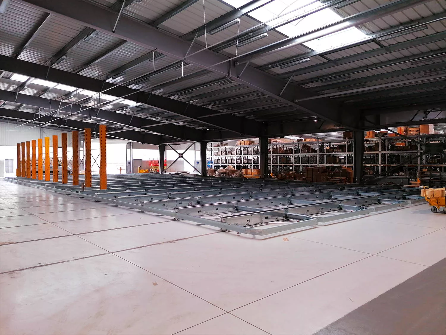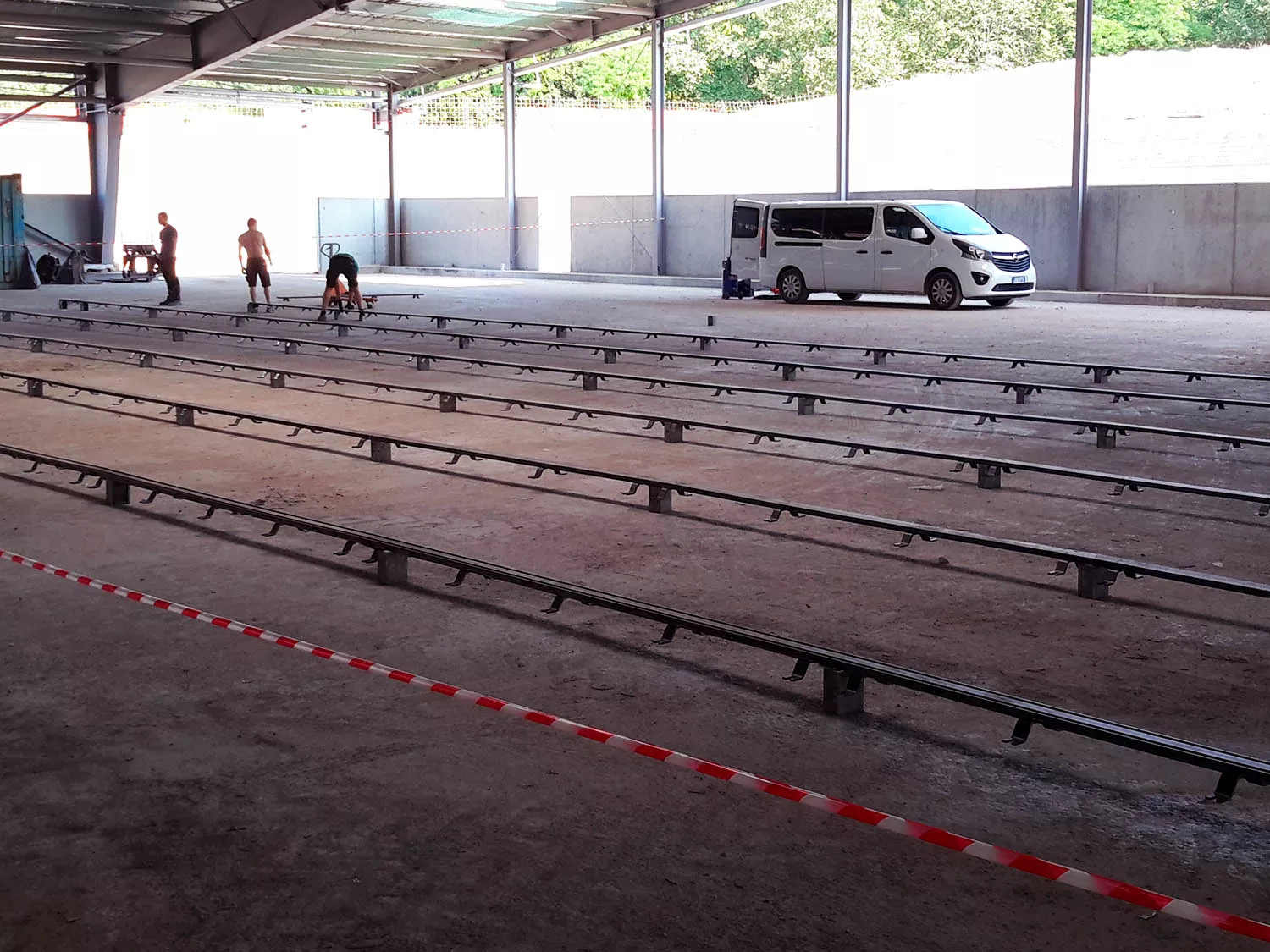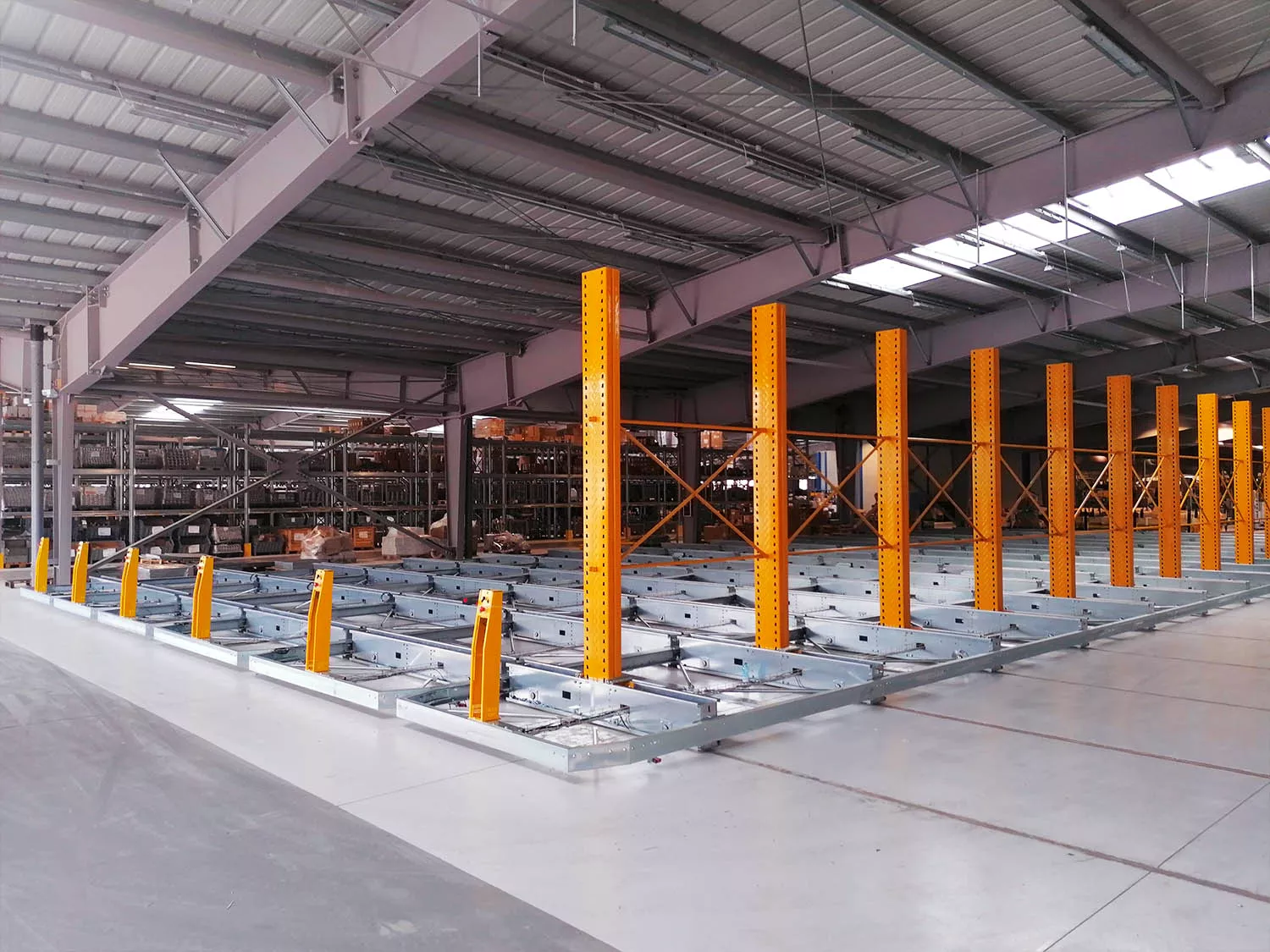 al livello del pavimento in corso di realizzazione sono stati posati 528 m di binari su cui posizionare le basi mobili a sostegno della nuova scaffalatura. La portata della singola slitta è di 24 tonnellate, la portata massima per ruota 12 tonnellate e la portata per base è di 240 tonnellate.