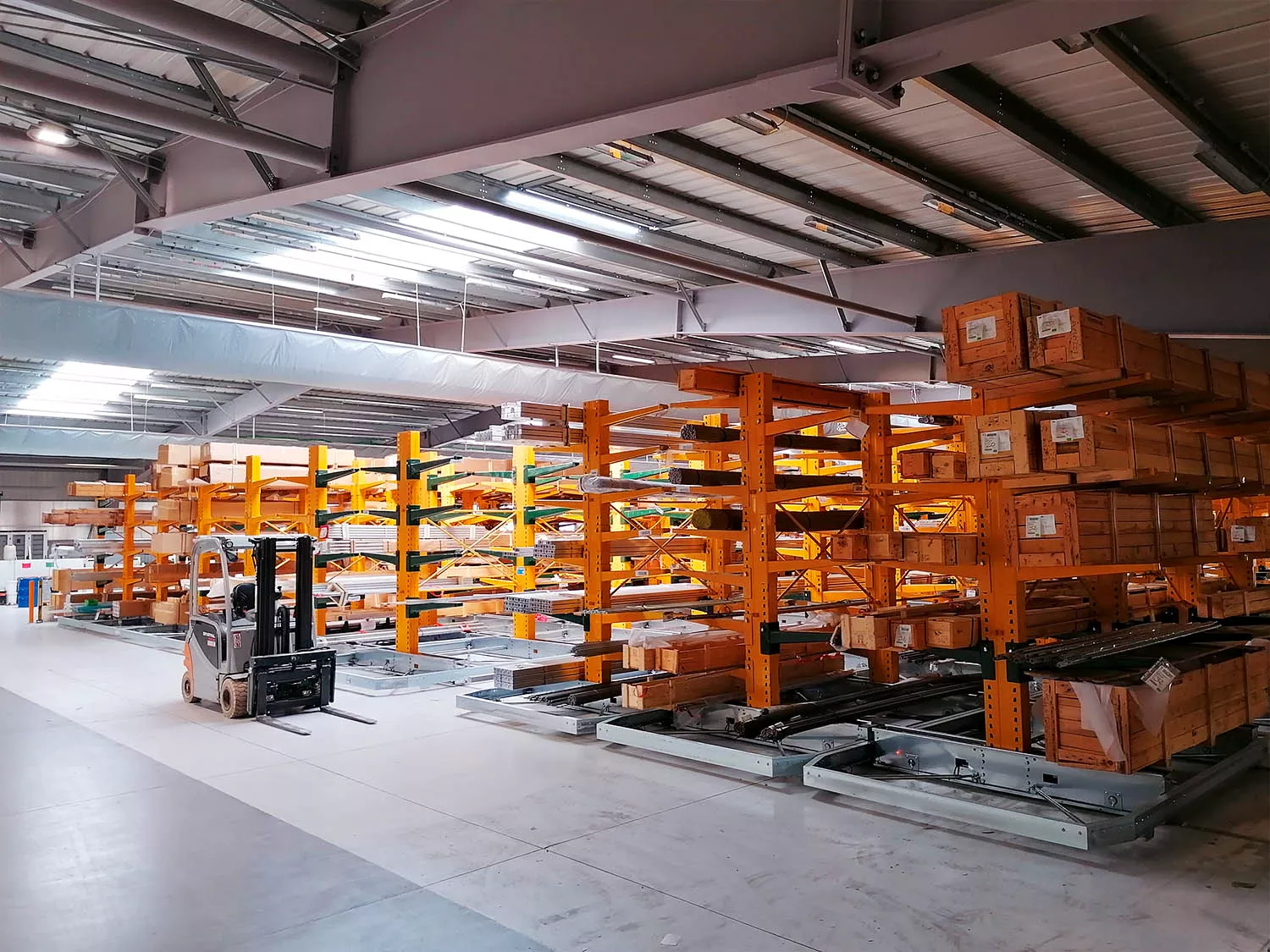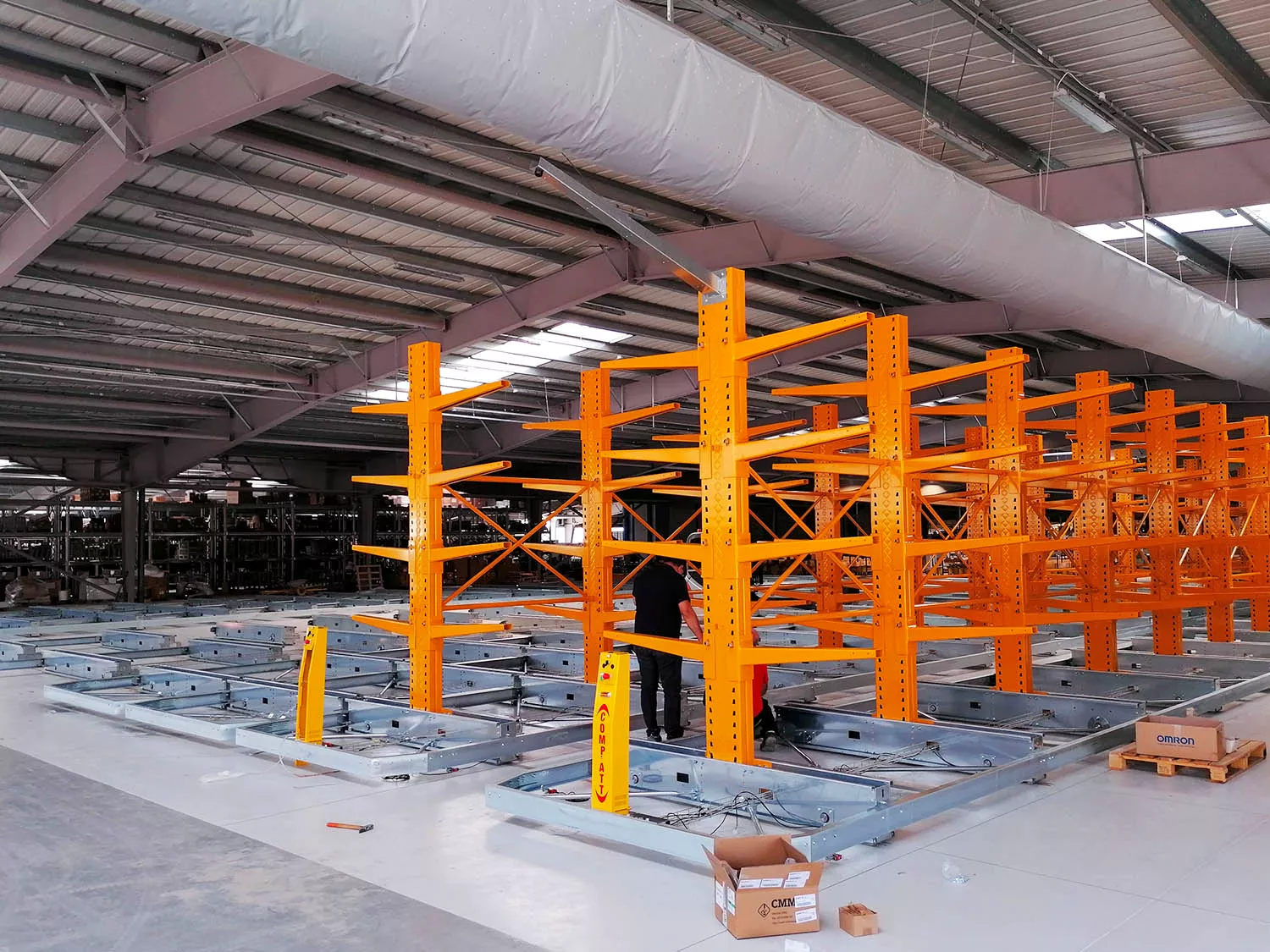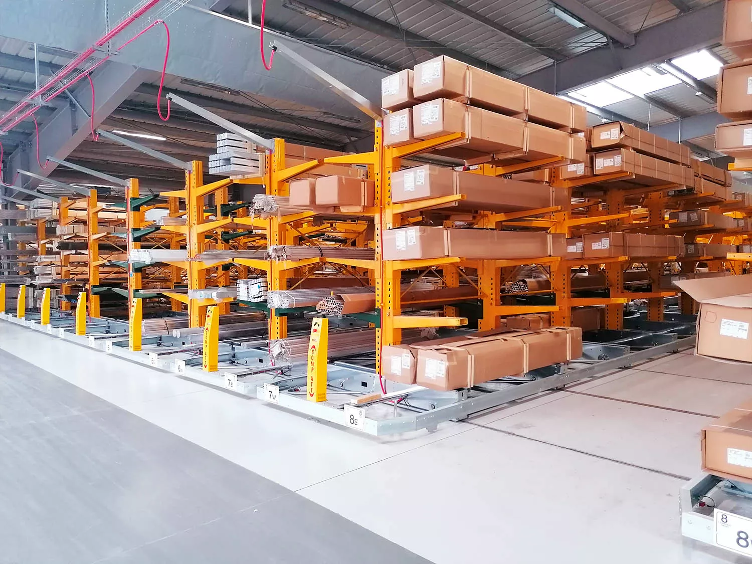 una volta posizionate le basi sono state montate su di esse 12 file di scaffalature cantilever appositamente pensate per lo stoccaggio di corpi lunghi. Le mensole sono adattabili alle caratteristiche del carico e sopportano pesi estremamente elevati. Come da desiderio del cliente è stato possibile adattare la vecchia scaffalatura alle nuove basi integrandola con elementi nuovi.