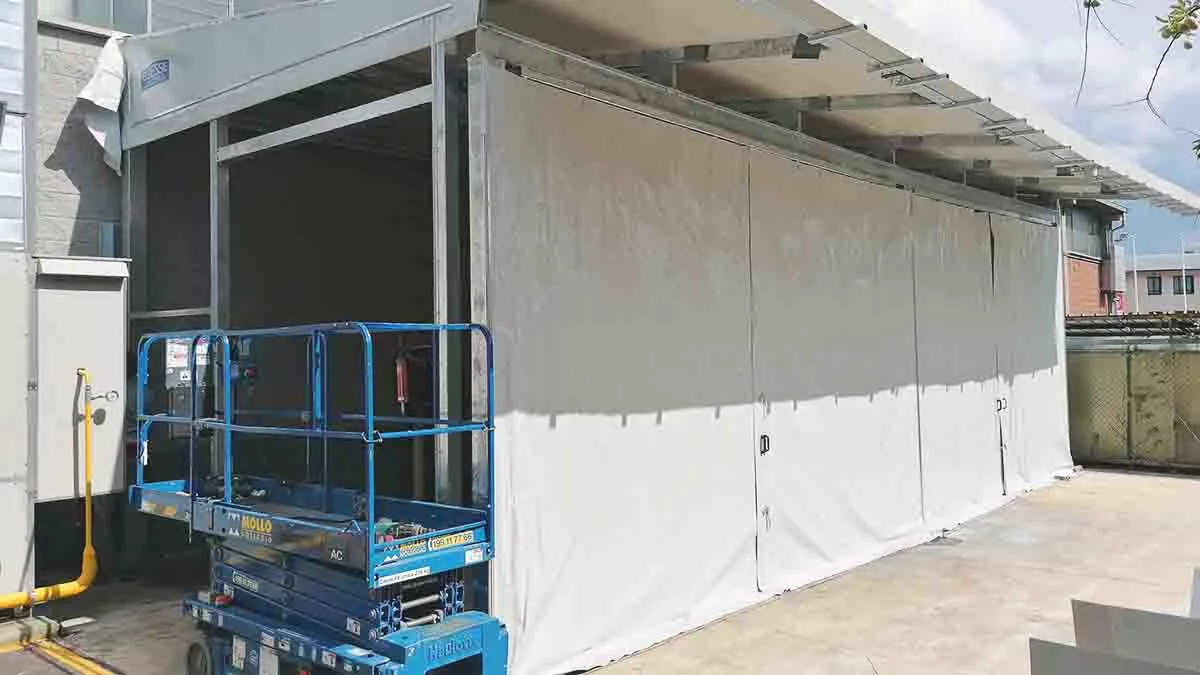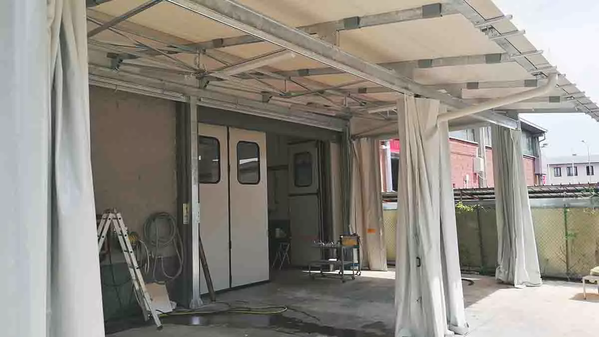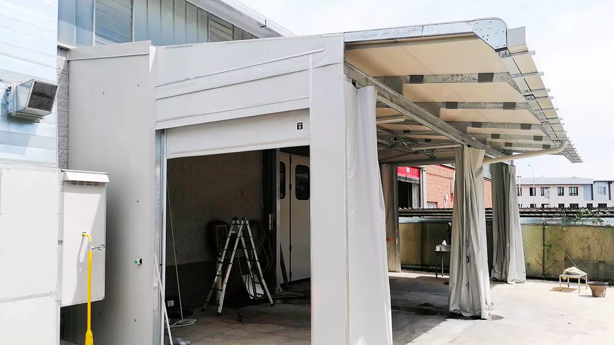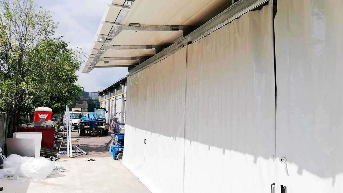 Installazione di una copertura fissa in PVC dotata di pannelli fissi, pannelli mobili e portone ad avvolgimento rapido.