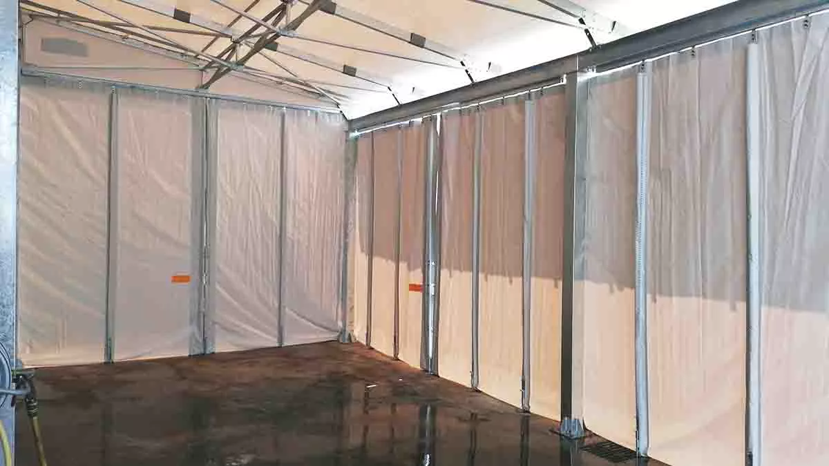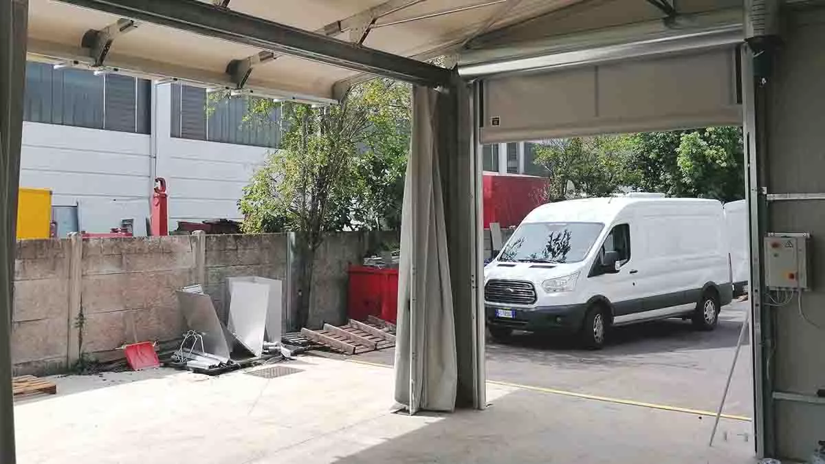 a ridosso del varco d’ingresso abbiamo realizzato una copertura fissa in PVC. La tettoia monopendenza è costituita da capriate in tubolare zincato a caldo, sostenute da travi e colonne ancorate a terra e dimensionate alla spinta vento e carico neve specifico del comune di collocazione. Il telo di copertura in PVC è autoestinguente in classe 2, montato aderente alla struttura metallica tramite piastre in velcro aeronautico ad alta resistenza. La tettoia è stata realizzata a sbalzo per far sì che sia possibile posizionare il camion al coperto anche quando la struttura è completamente chiusa. La copertura è infatti corredata frontalmente e sul lato destro di tende in PVC biplasmato che possono essere tenute completamente aperte, ma che, se chiuse, permettono il perfetto isolamento della struttura da freddo e intemperie.