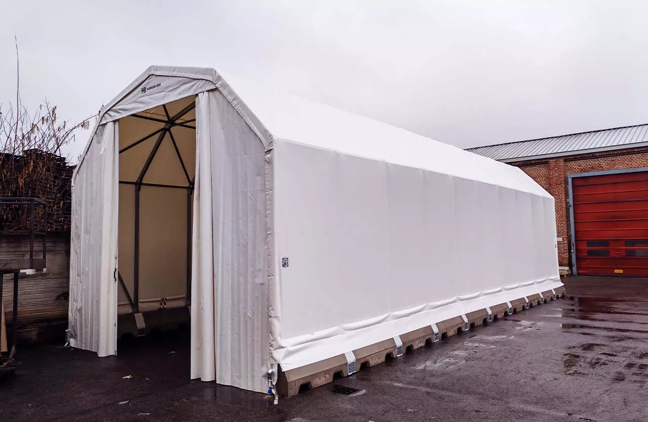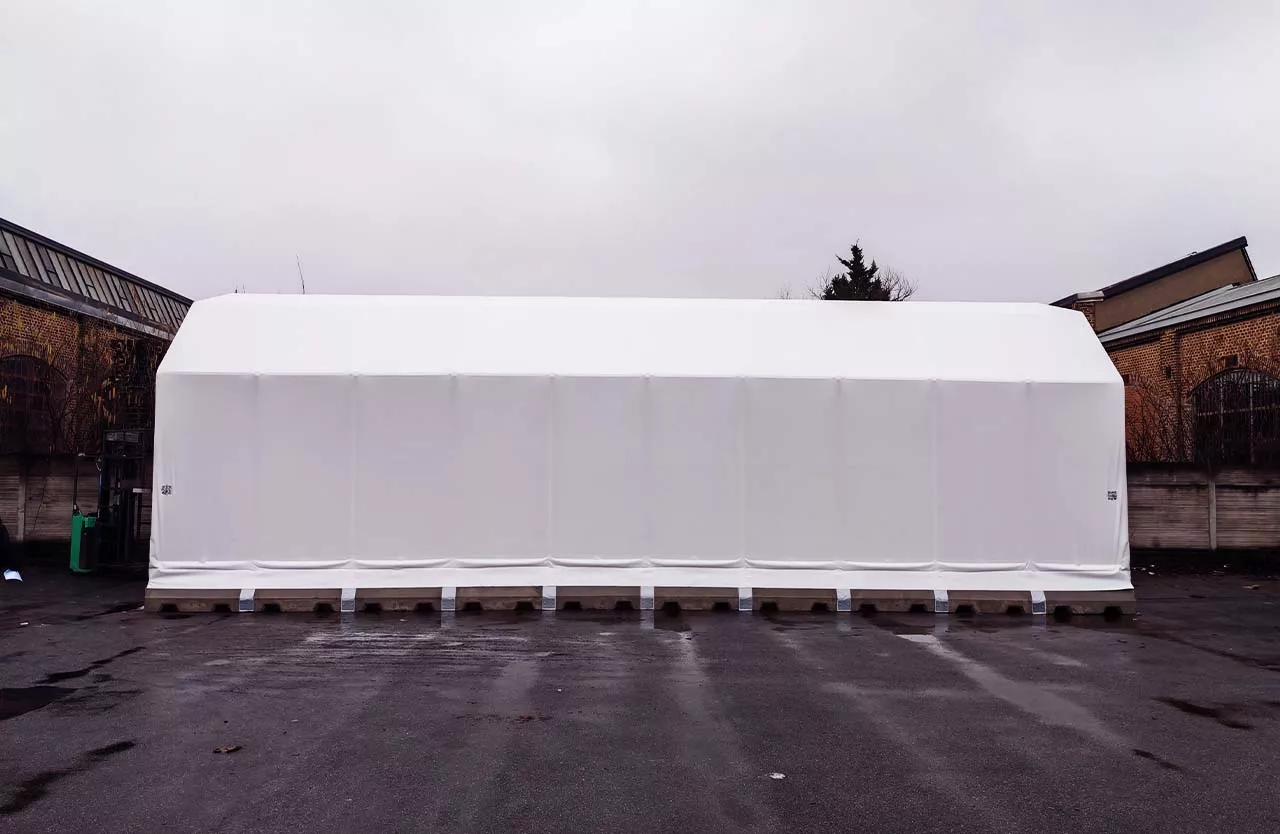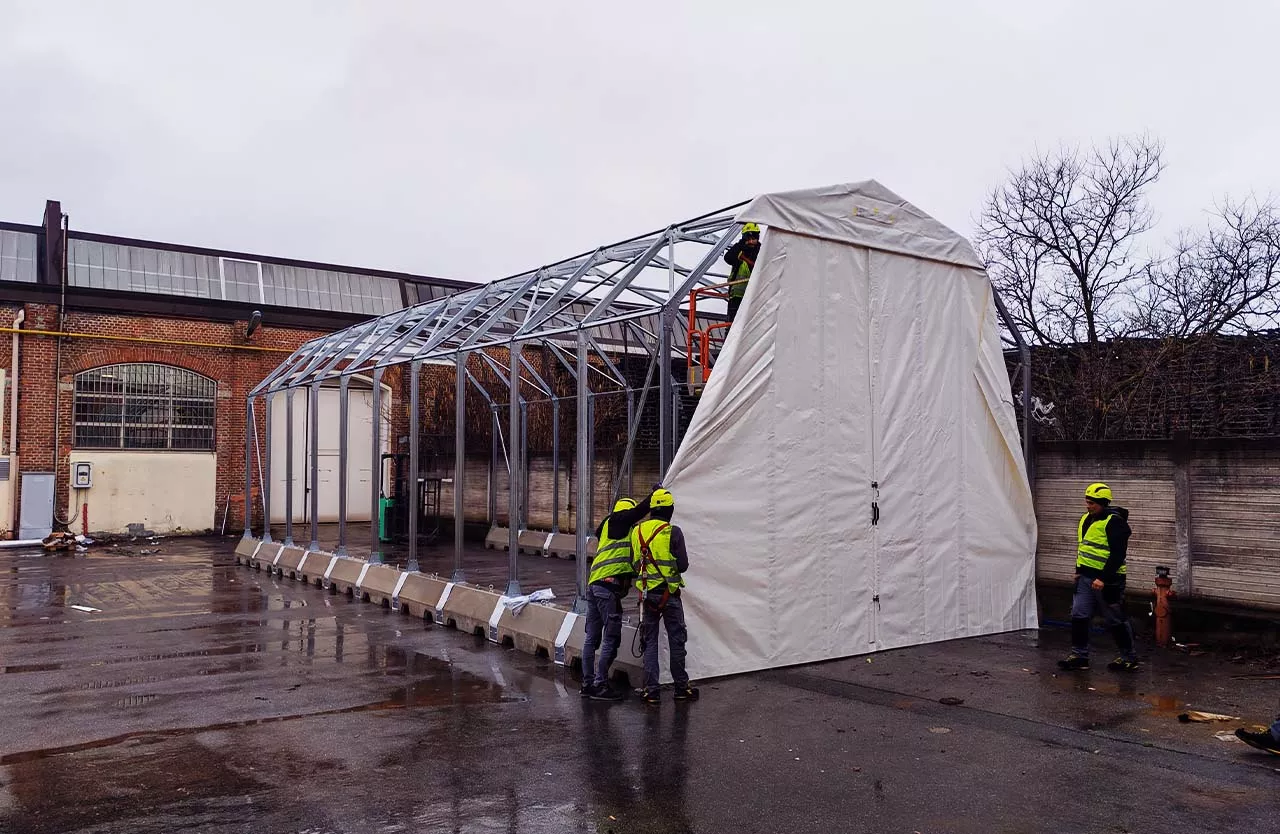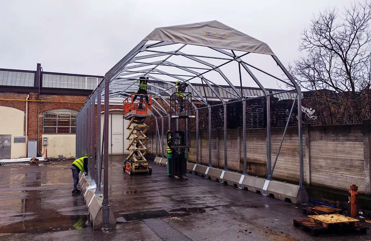 Nell’area prescelta del piazzale abbiamo istallato un tunnel mobile in PVC selezionato dal cliente tra 8 misure disponibili in pronta consegna, evitando qualsiasi tipo di opera muraria e rendendo più snelle possibili le procedure burocratiche, senza rinunciare a solidità e robustezza.