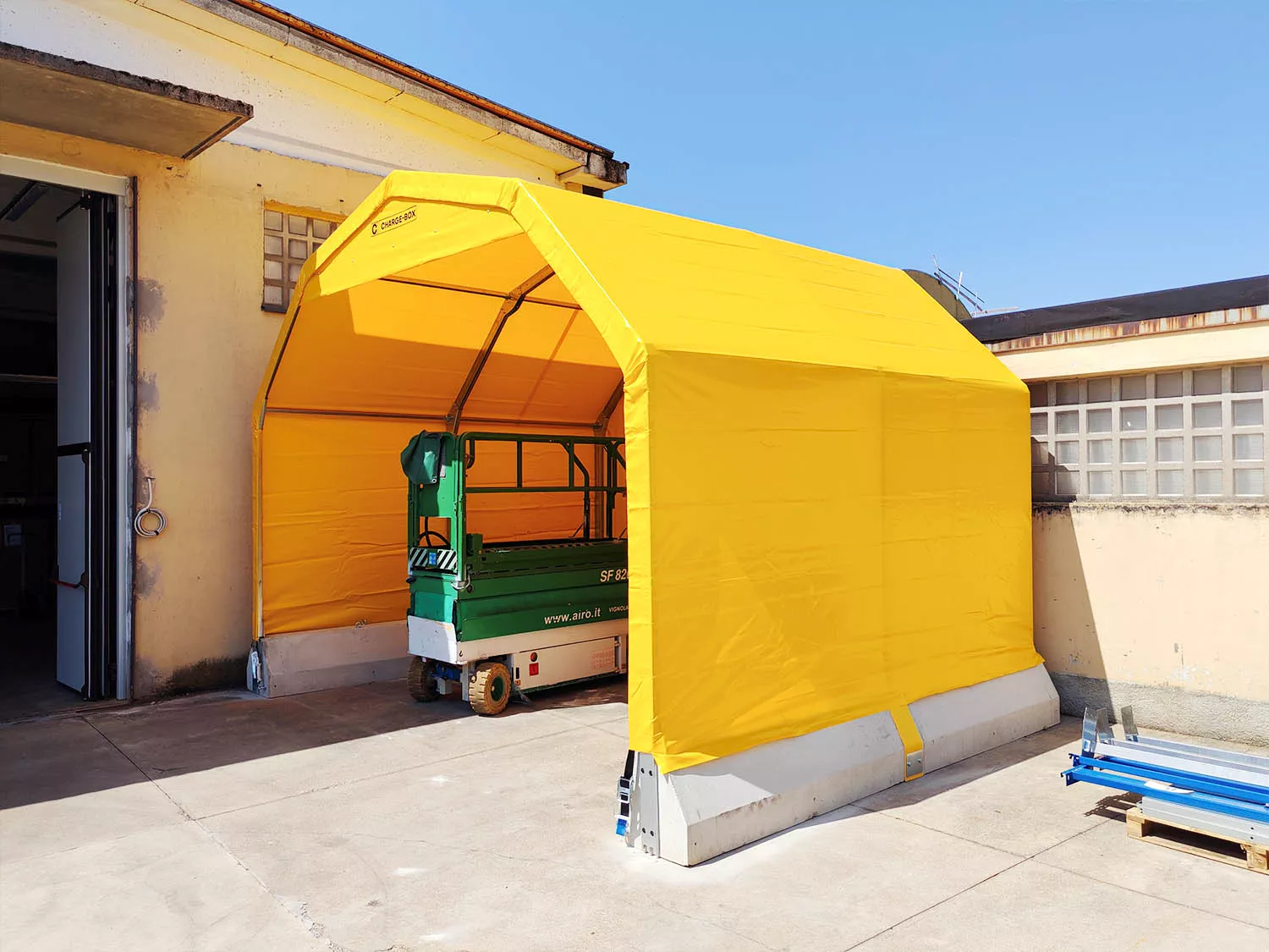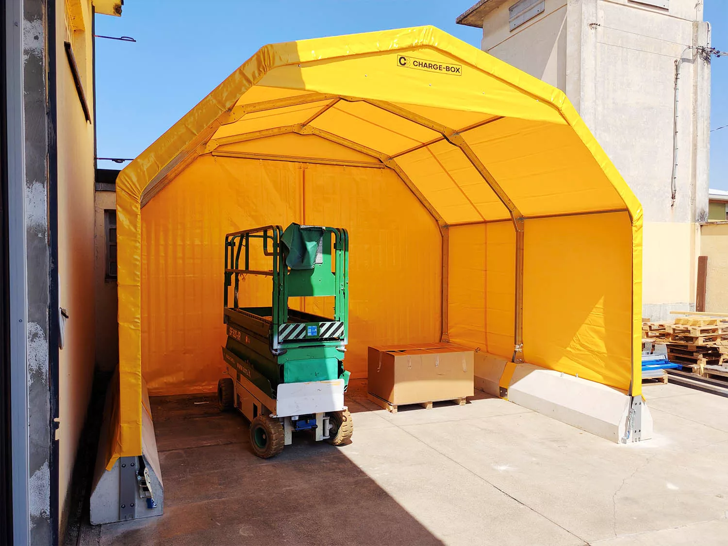 Il posizionamento all’esterno facilita l’osservanza delle prescrizioni relative ad areazione e isolamento, ma la robusta struttura in tessuto PVC, testato per sopportare carichi di 100 kg/mq di neve e raffiche di vento fino a 100 km/h, preserva dalle intemperie il carica batterie e i mezzi aziendali.