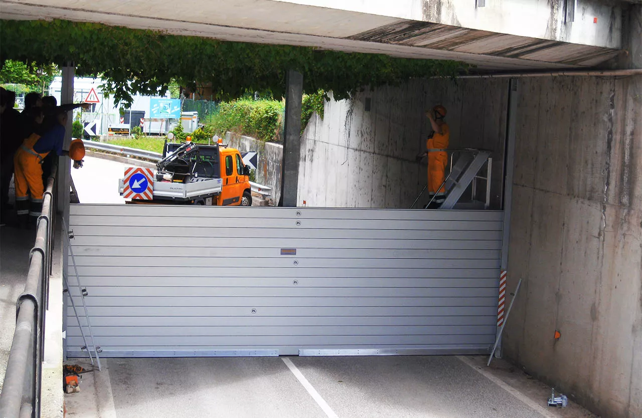 Paratia a funzionamento elettropneumatico, ideale per isolare passaggi di edifici, garage sotterranei, ecc. Può essere attivata manualmente o tramite sensori di rilevamento liquidi. Il sistema di sicurezza attiva un allarme optoacustico simultaneamente. Quando non è in uso, la paratia è carrabile e la superficie antiscivolo. I vari componenti strutturali sono in acciaio inox.